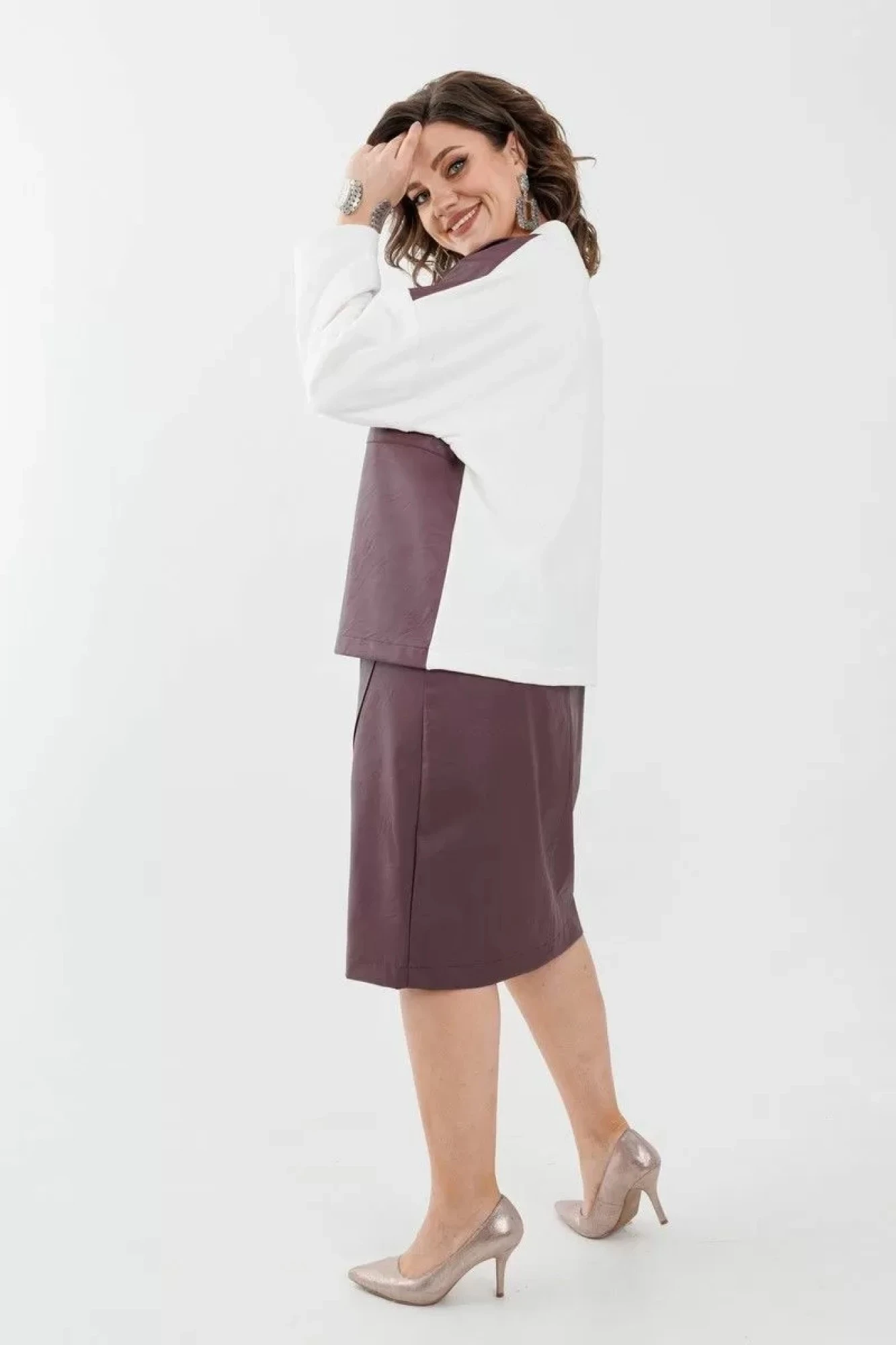 Сочетание эко кожи и трехнитки создает эффектную игру текстур, а длина юбки до колена делает образ женственным и элегантным.