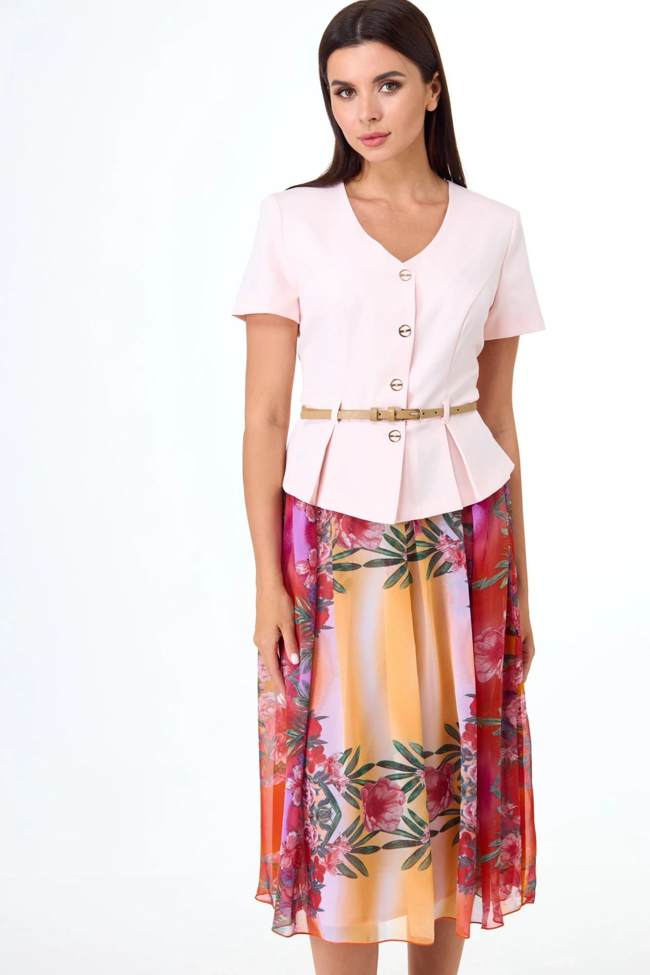 Комплект, состоящий из жакета и юбки. Выполнен из ткани с компаньоном в единой цветовой палитре.