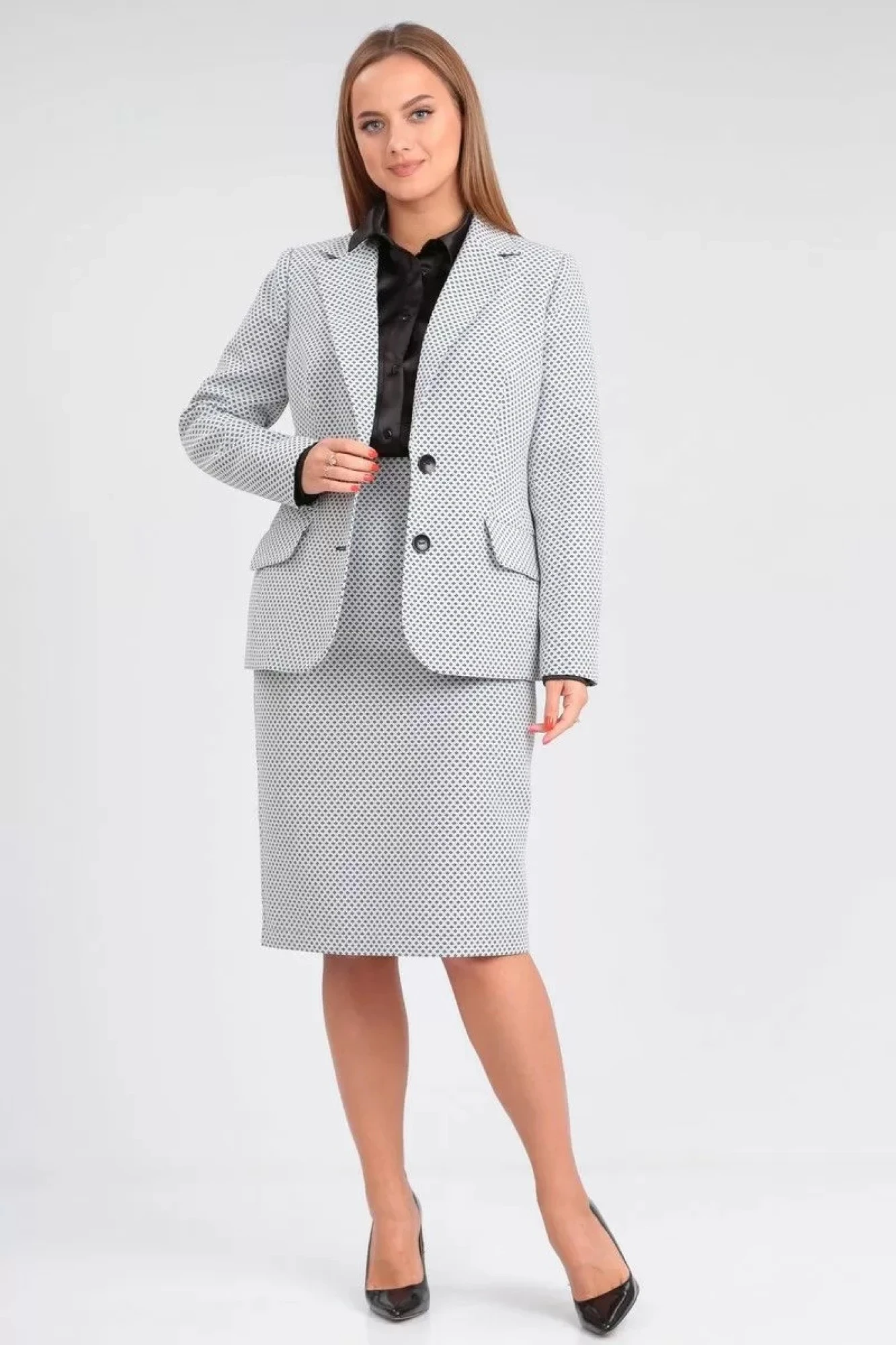 Элегантный женский комплект для настоящей леди состоит из классических жакета и юбки-карандаш. Однобортный жакет полуприталенного силуэта, на подкладке, с плечевыми накладками. Воротник пиджачного типа с отложными лацканами. По переду центральная застежка на петли и пуговицы и прорезные карманы с клапаном, талиевые вытачки и рельефы. Низ бортов закругленной формы. Спинка со средним швом. Рукав втачной двухшовный длинный.