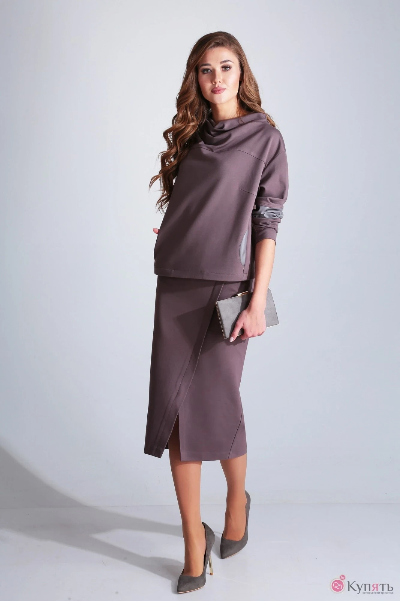 Костюм женский 2-х предметный,состоящий из стильной блузы свободного силуэта и прямой юбки. Выполнен из качественного трикотажного полотна. По переду блузы сделана отрезная кокетка с цельнокроеным воротником стойкой с защипами по плечевому срезу. Также по переду имеются рельефы, в которых расположены удобные карманы с входом с листочкой из кожзама. На спинке-кокетка, по центральной части настрочен декор в виде стильной нашивки. Рукава спущены, на уровне локтей выполнены вставки из кожзама.