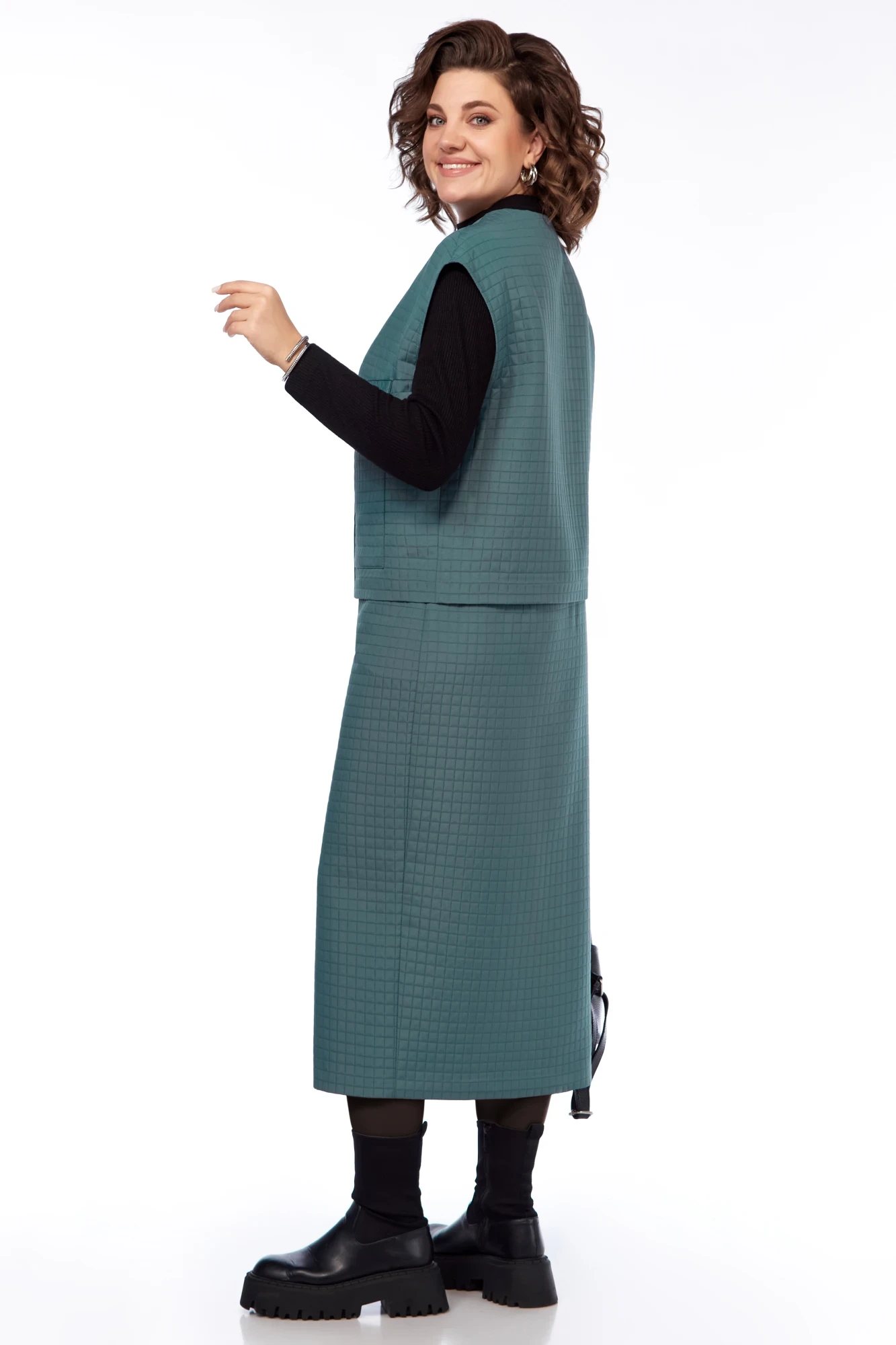 Стильный женский костюм тройка,состоящий из жилета и юбки, выполненных из плательно-костюмной ткани под "стежку" и джемпера-водолазки из трикотажного полотна "лапша".