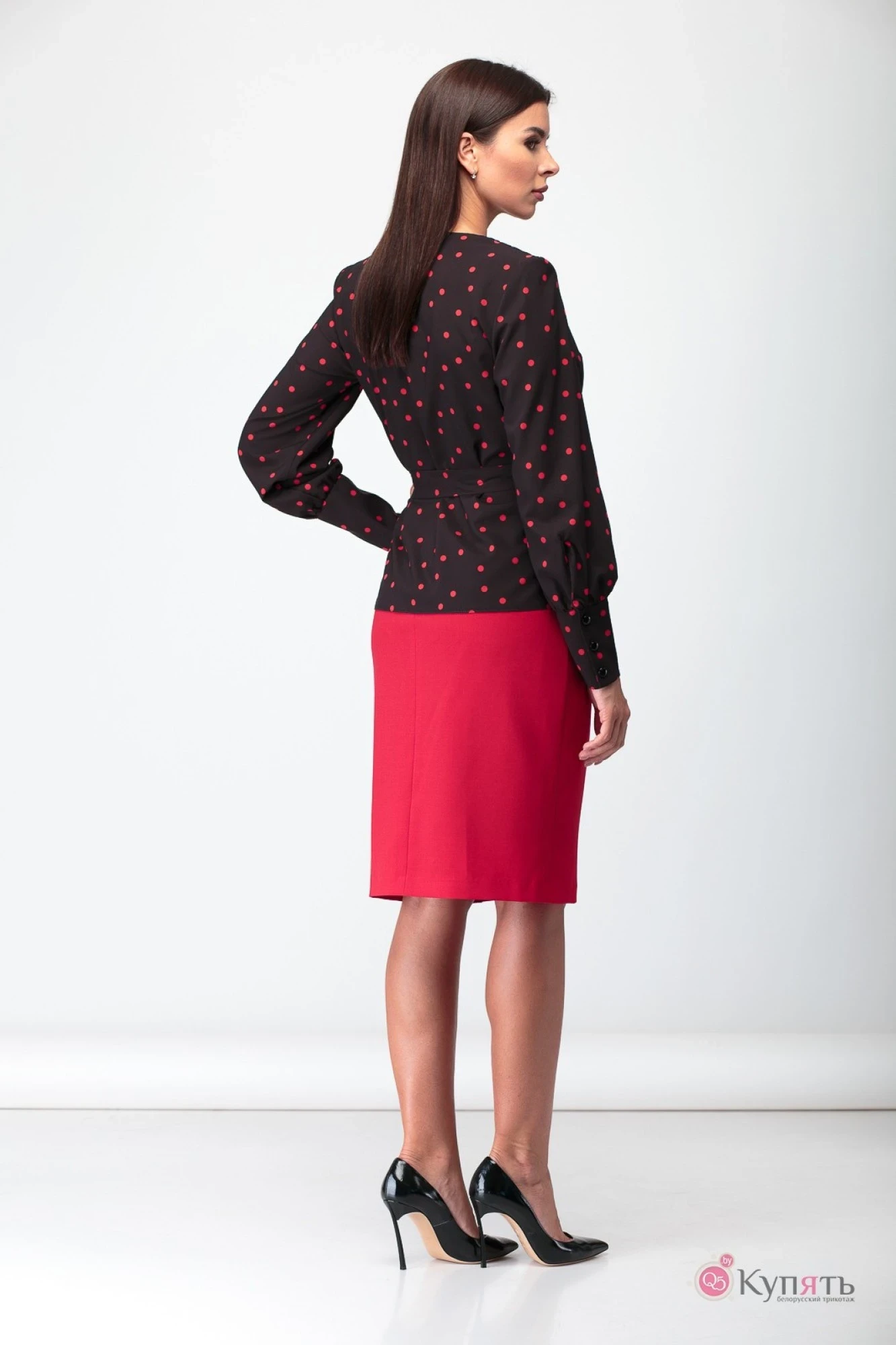Костюм женский, состоящий из блузки назапах и юбки. Блузка прямого силуэта. Перед назапах. По плечу имеется декоративная сборка. Низ блузки фигурной формы. Блузка приталивается поясом. Рукав длинный, с манжетами. Юбка прямого кроя, заужена к низу. По переду юбки в боковой части есть декоративная шлица. Длина юбки 60+-2см.
