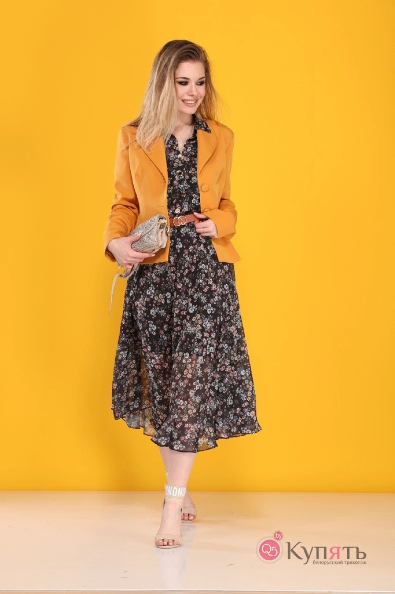 Стильный повседневный комплект-двойка, состоящий из жакета и платья. Жакет короткий, приталенного силуэта с рельефами на передней и задней частях. Воротник пиджачного типа, стояче-отложной. Спереди застежка на три пуговицы. Рукав длинный, двухшовный, втачной. В комплекте к жакету прилагается широкий пояс на пряжке. Платье нарядно-повседневное из легкой, струящейся ткани. Длинное, свободного силуэта, отрезное по линии талии, на резинке. Верхняя, передняя часть платья с застежкой на пуговицы. Нижняя часть платья широкого, свободного кроя типа "татьянка". Воротник рубашечного типа, стояче-отложной. Рукав длинный, одношовный, втачной, на сборке в нижней части.