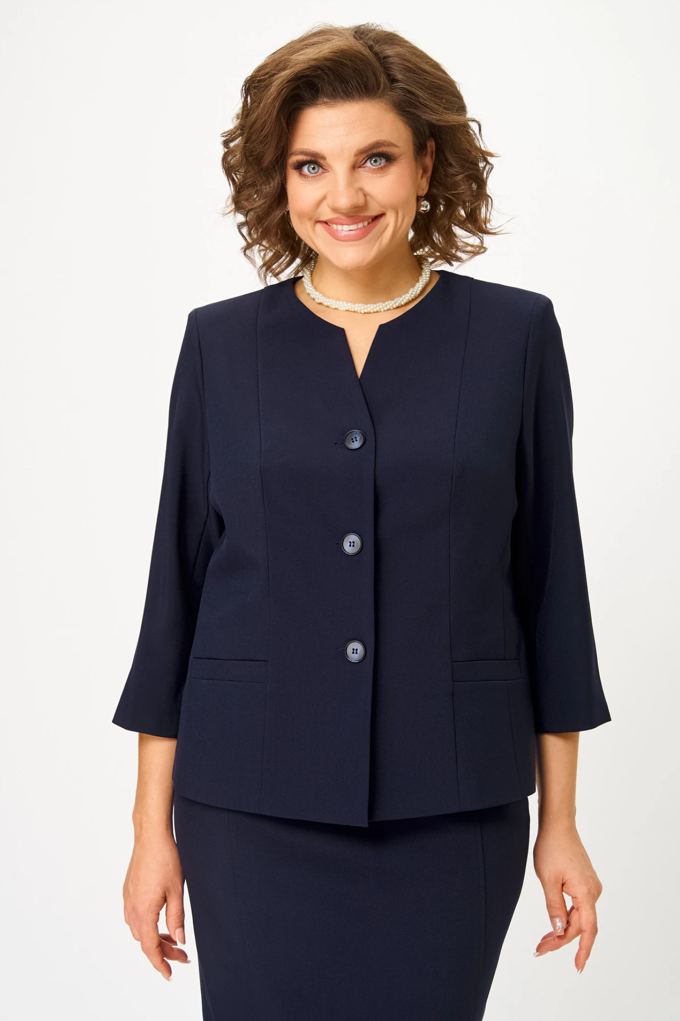 Женский комплект 2-х предметный состоит из жакета и юбки. Жакет классический,с V-образным вырезом, полуприлегающего силуэта с центральной бортовой застежкой на петли-пуговицы. Спереди рельефные швы от плечевого шва, отрезной бочок и карман с втачной листочкой. Спинка с рельефами от плечевого шва. Рукав втачной, двухшовный, укороченный. Перед жакета на подкладке. Длина рукава 48 см, длина жакета по спинке 59 см. Юбка прямого силуэта, верхний срез юбки обработан обтачкой, заднее полотнище со средним швом, застегивается на потайную молнию. Шов переходит к низу в шлицу. Юбка по переднему и заднему полотнищу с кокеткой и вертикальными рельефами, швы отстрочены в цвет юбки. Длина по боковому шву 70 см. Юбка на подкладке.