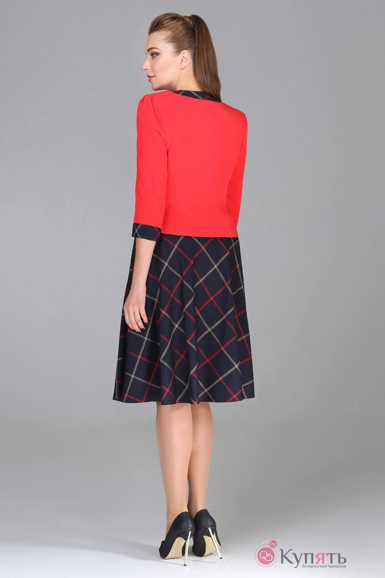 Элегантный женский костюм. Жакет полуприлегающего силуэта. По переду горловина круглая, по горловине и краю борта отрезная планка из отделочной ткани, на уровне бедер обработаны листочки из отделочной ткани. Рукава втачные, головка рукава заложена складками, по низу отрезной манжет из отделочной ткани.