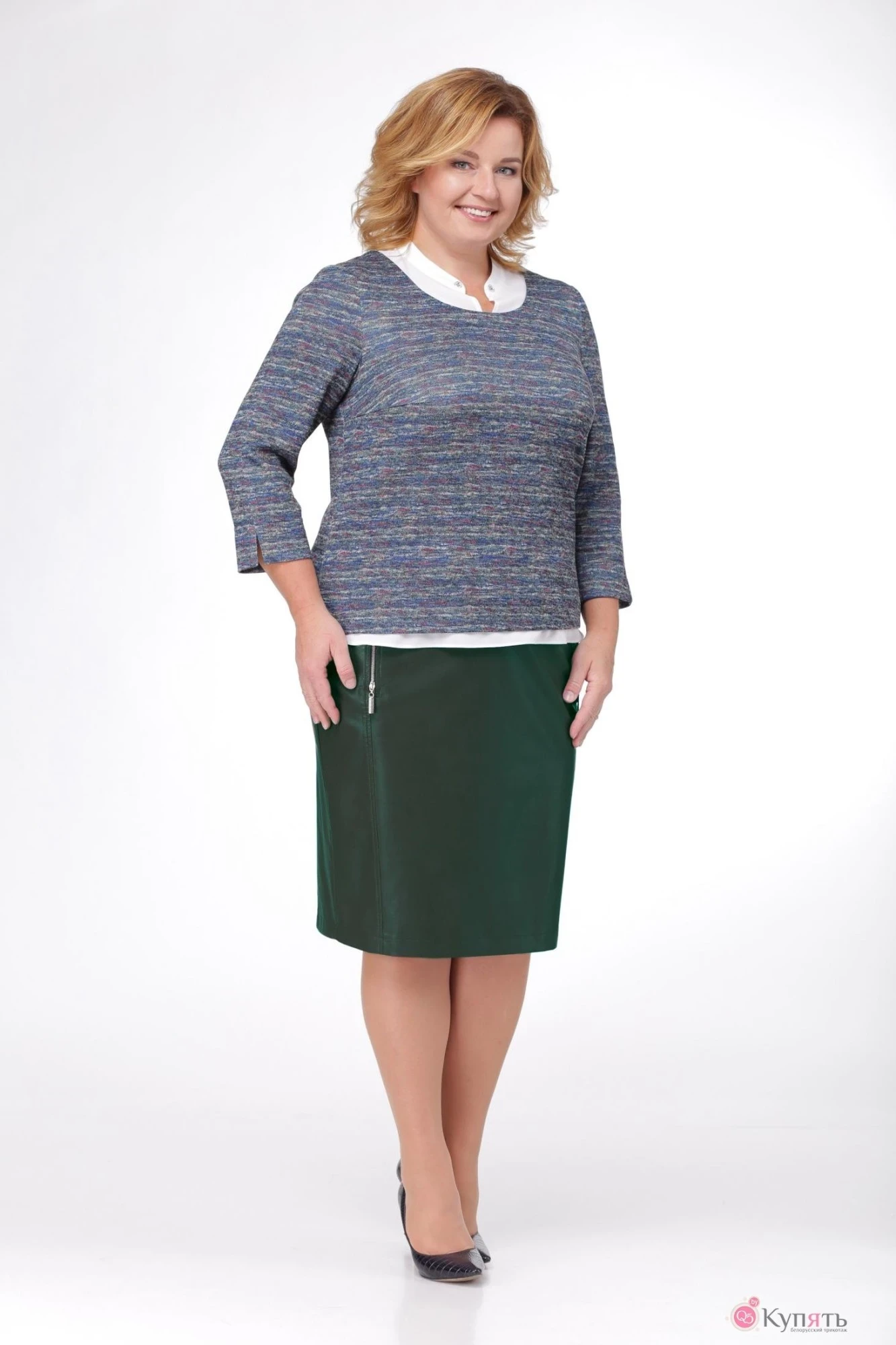 Элегантный женский комплект состоит из блузона и юбки. Блузон выполнен из трикотажного полотна . В блузоне использован эффект двухслойности по горловине и низу имитация рубашки из креповой ткани. Рукава втачные со швом, по низу шва - разрез. Юбка выполнена из искусственной кожи , зауженный книзу, по переду и спинке рельефные швы. По переду в рельефных швах вставленные декоративные молнии, верхний срез оформлен обтачкой, застежка на молнию в центральном шве спинки, по низу шлица. юбка на трикотажной подкладке.