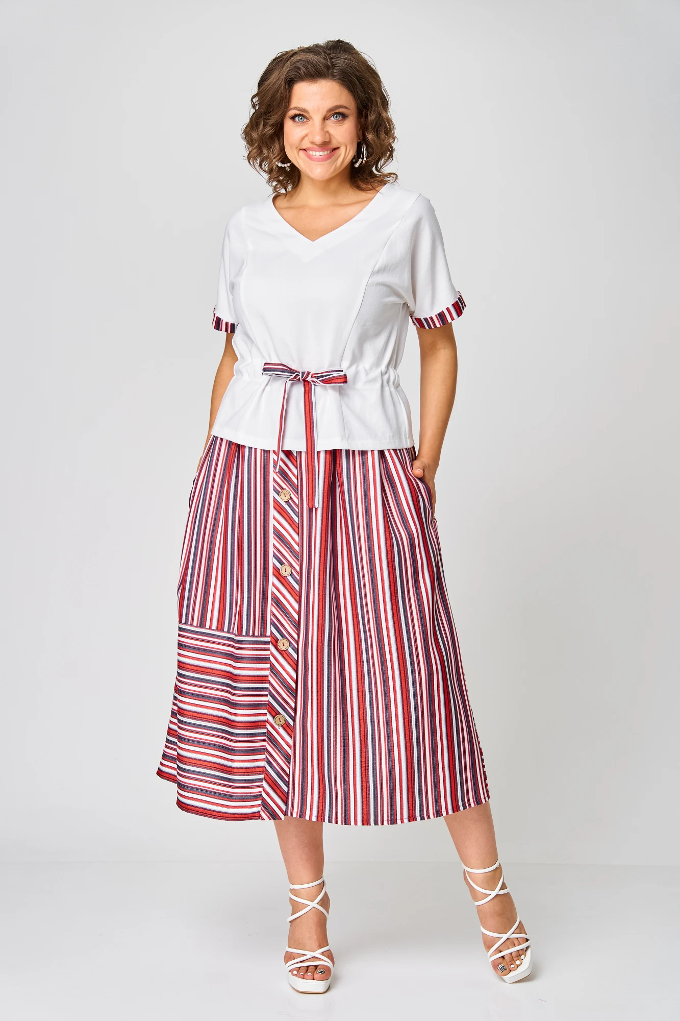 Романтичность и привлекательность сочетаются в данной модели. Это костюм, состоящий из блузы и юбки, выполнен из ткани лён с содержанием эластана. Блуза свободного прямого силуэта из однотонной ткани с отделочными элементами ткани-компаньона в полоску. По переду вырез горловины V-образной формы, обработан обтачкой с отделочной строчкой, Рукав цельнокроеный короткий с отложной манжетой из отделочной ткани, по переду вертикальные рельефы, спинка цельная. Линию талии подчёркивает пояс из отделочной ткани, который протянут в кулиску. Юбка А-образного силуэта, пояс отрезной с эластичной резинкой по всей длине, по центру переда притачные планки с застежкой на петли-пуговицы. По талии от шва притачивания к поясу, расположены мягкие бантовые складки по переду и спинке юбки. В боковых швах расположены внутренние карманы. Геометрическая игра полоски позволяют изделию выглядеть стильно и эффектно. Летний костюм весьма практичен и комфортен в жаркие солнечные дни, при этом позволяет выглядеть стильно и романтично.