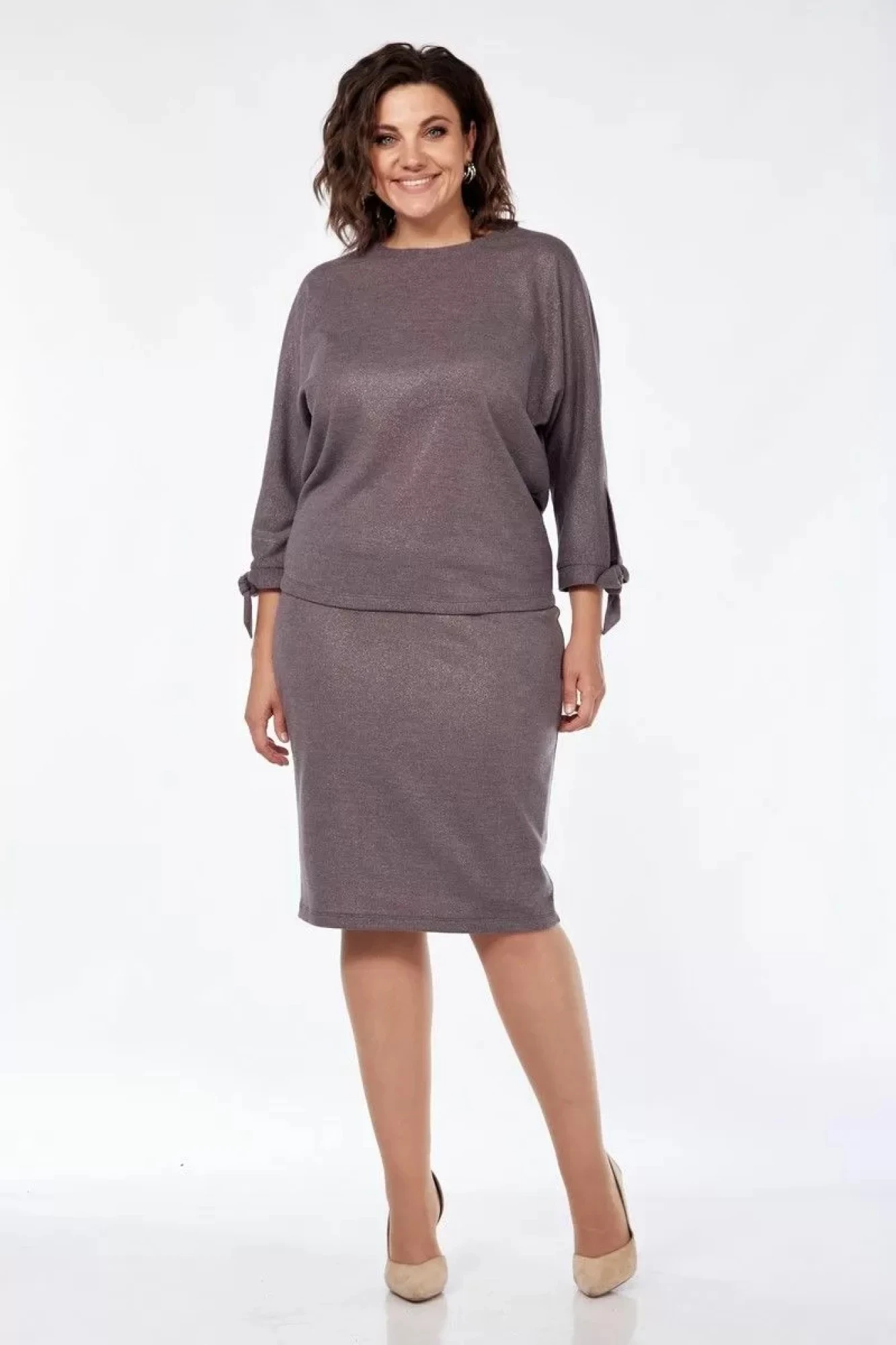 .Костюм женский с юбкой из трикотажного полотна с блеском. Юбка длиной за колено, зауженная к низу. Заднее полотнище сверху на резинке. Кофта с горловина округлой формы. Рукав цельнокроенный с плечом. По низу на манжетах и завязках.