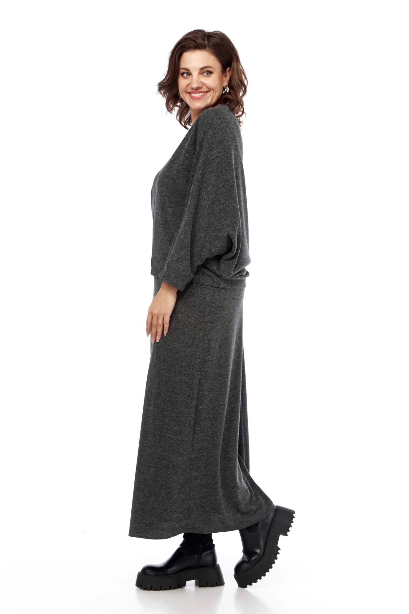 Костюм женский с юбкой из трикотажа. Кофта с цельнокроенными рукавами и отрезными бочками. Перед со средним швом и защипом на 0,2 см вдоль него. Спинка со средним швом. Горловина V-образной формы. В качестве отделки нашивка в правом нижнем углу переда. Юбка длинная, расклешеная к низу. Заднее полотнище со средним швом. Пояс выполнен из декоративной эластичной тесьмы. Внешний вид фурнитуры может отличаться от заявленной на фото.