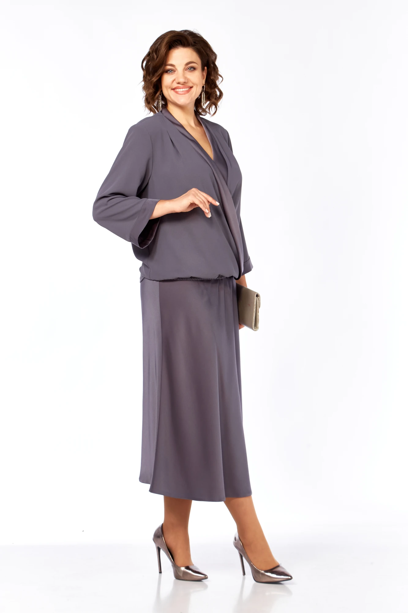 "Костюм женский с юбкой выполнен из двух видов ткани. Юбка расклешенная, длинная, выполнена из атласной ткани. Блуза из креповой ткани, а манжеты и шалевый воротник из атласа. Полочки с застроченными складками от плеча. Перед с запахом, по низу собран на резинку. Воротник-стойка переходящая в мягкий отворот к низу. Рукав втачной, одношовный, с притачными манжетами. Спинка оп низу округлой формы.