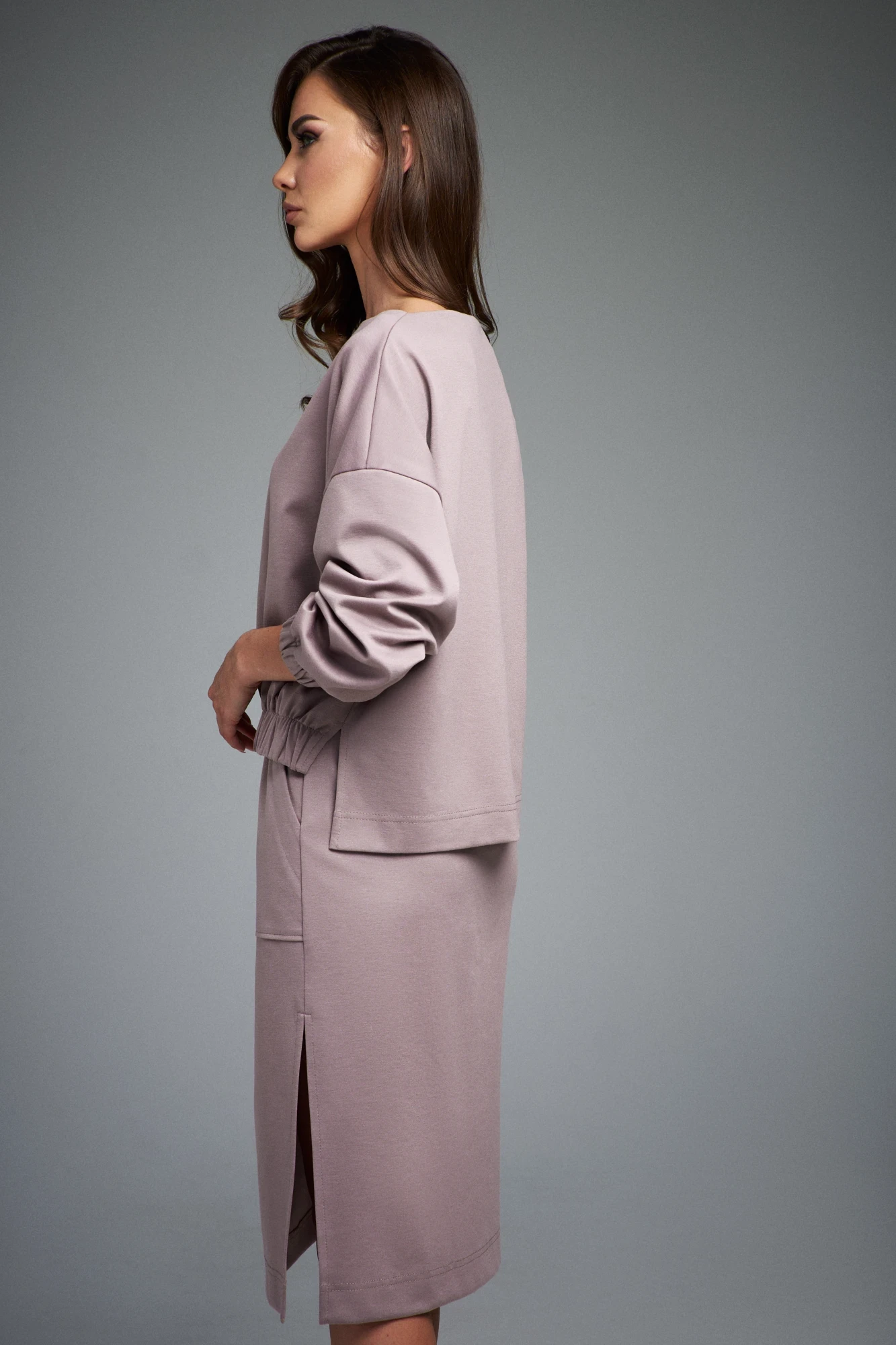 Комплект женский трикотажный, состоит из джемпера и юбки. Джемпер прямого свободного силуэта с горловиной-"Лодочка". Полочка укороченная с широкой резинкой по низу, в боковых швах выполнены разрезы. Юбка прямая с поясом на резинке, накладными карманами и разрезом в правом боковом шве.