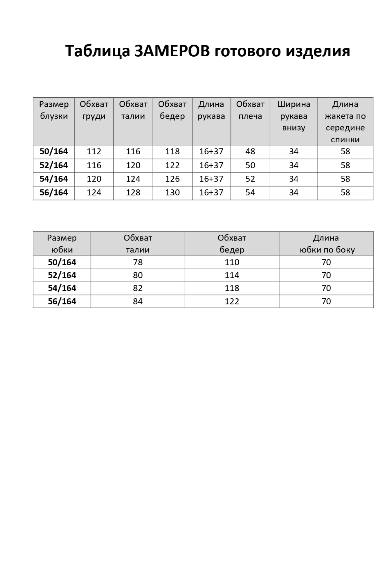 Таблица размеров