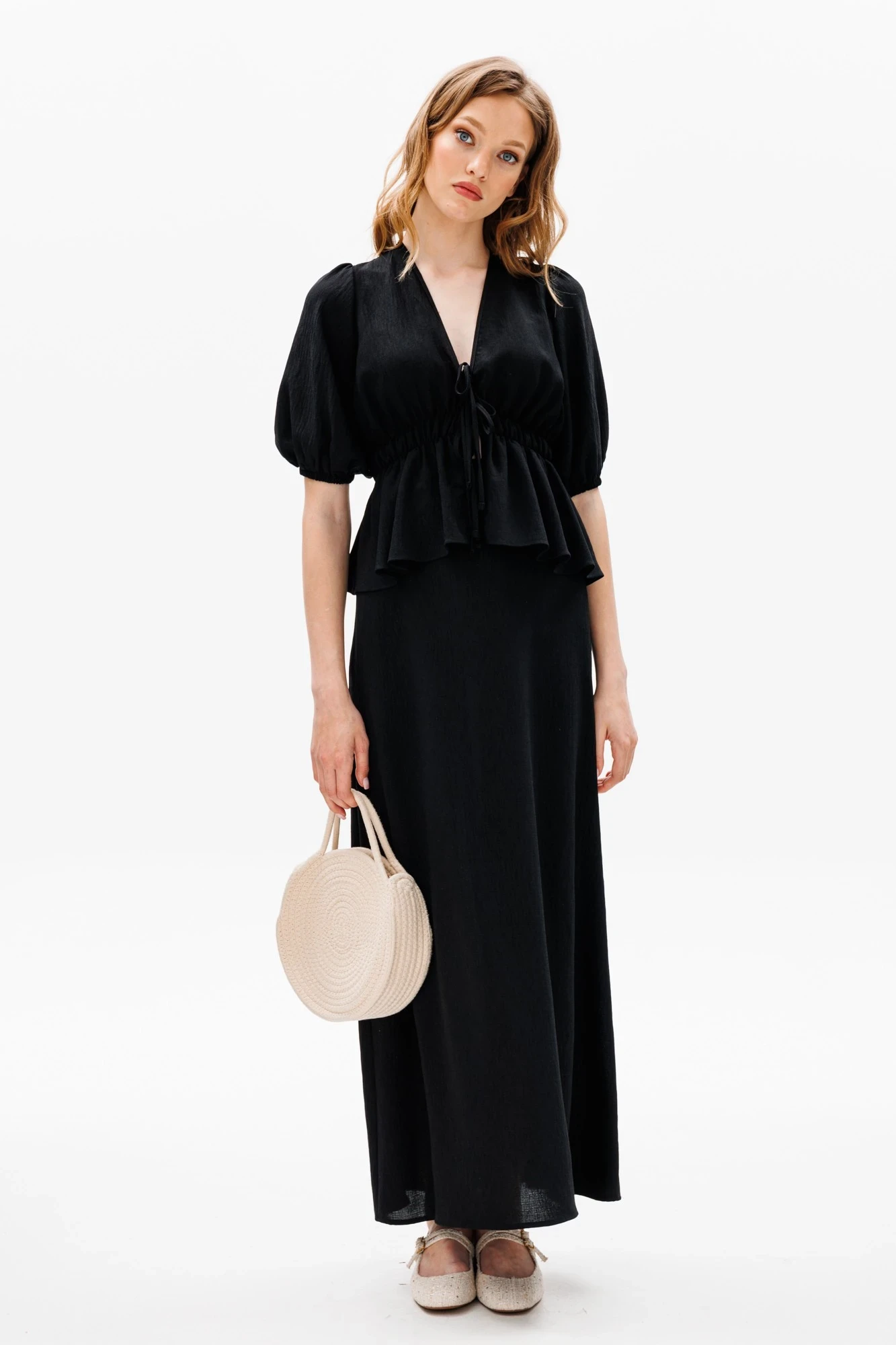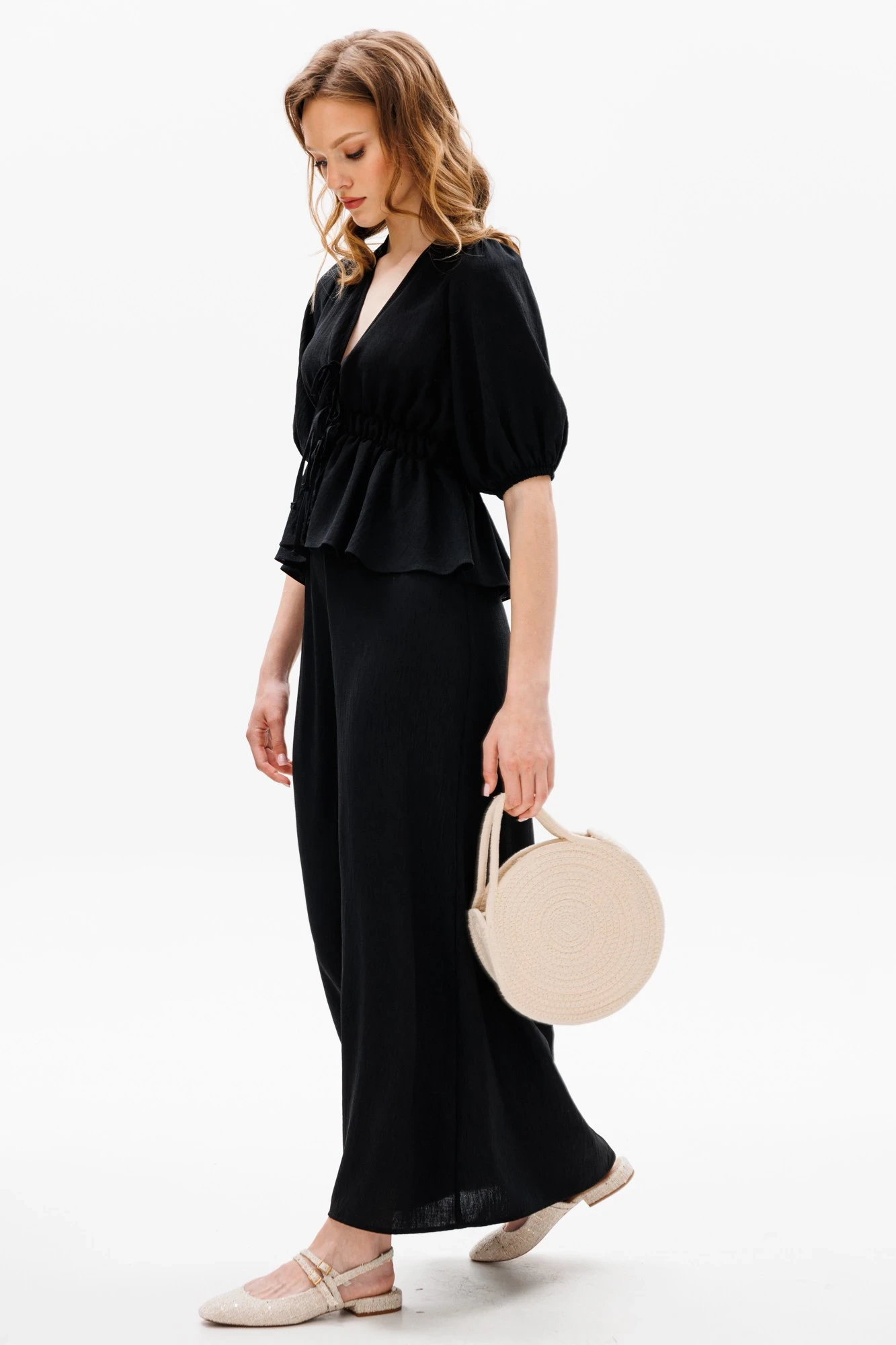 Комплект: блузка + юбка. Комплект выполнен из плательной ткани. Блузка полуприлегающего силуэта, длиной выше линии бедер, по линии талии собрана на венгерку. Горловина V-образной формы. Спереди застежка встык на завязки. Спинка длиннее переда. Рукав втачного покроя, одношовный, длиной чуть ниже линии локтя. Низ рукава присборен и обработан эластичной тесьмой. Юбка расширена к низу, на притачном поясе, длиной миди. В среднем шве полотнища спинки застежка в виде потайной молнии. Пояс застегивается на пуговицу. Юбка на отлетной по низу подкладке.