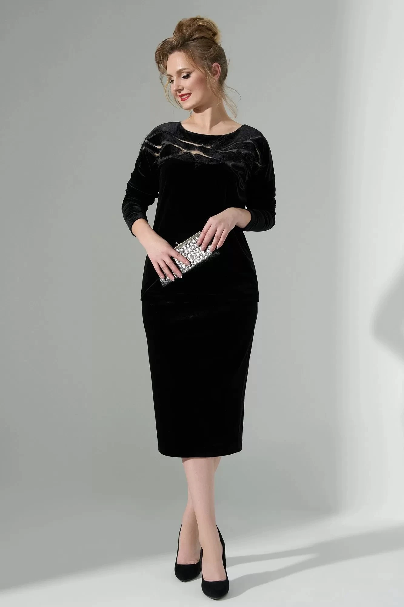Костюм женский состоит из джемпера и юбки, выполнен из велюра. Джемпер прямого кроя, горловина округлая, рукав длинный приспущенный, На линии груди джемпера расположена Аппликация с полупрозрачными вставками. Юбка карандаш выполнена из велюра, на притачном поясе. Застежка потайная молния и кнопки. Изделие на подкладке