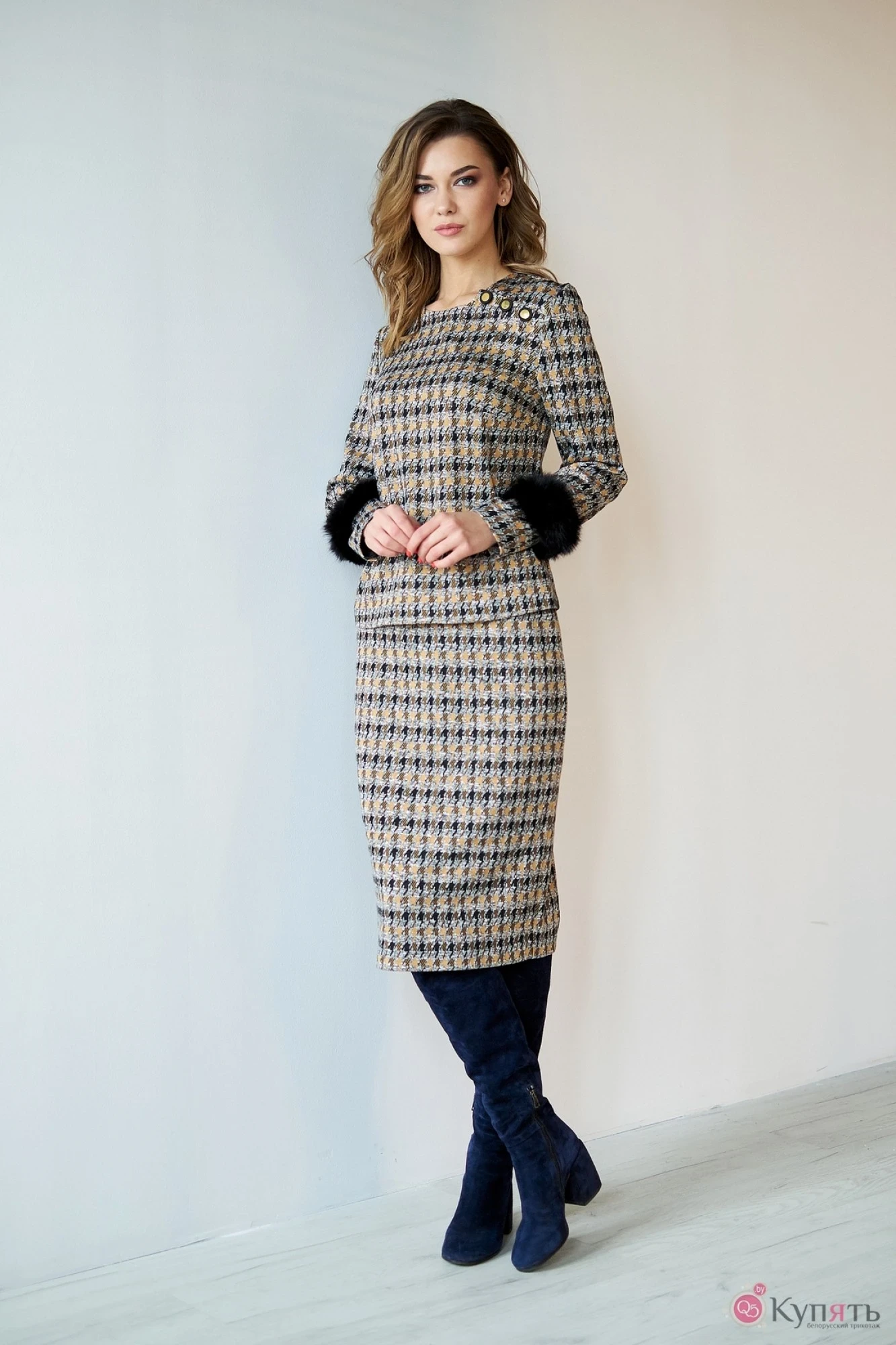 Каждый новый сезон привносит что-то новое в классический дизайн женского костюма, одно лишь остается неизменным - он позволяет подчеркнуть достоинства фигуры и выглядеть элегантно в любом месте. Классическое жаккардовое трикотажное полотно переплетение "гусиная лапка" с вкраплением яркого цвета. Юбка-карандаш на поясе, с эластичной тесьмой в области боковых швов и шлицей на правом боковом шве с отделочными пуговицами. Джемпер упрямленного силуэта, с втачным длинным рукавом, нагрудной вытачкой и асимметричной кокеткой-застежкой. Особый шарм модели придают полоски меха, пристегивающиеся к рукавам.