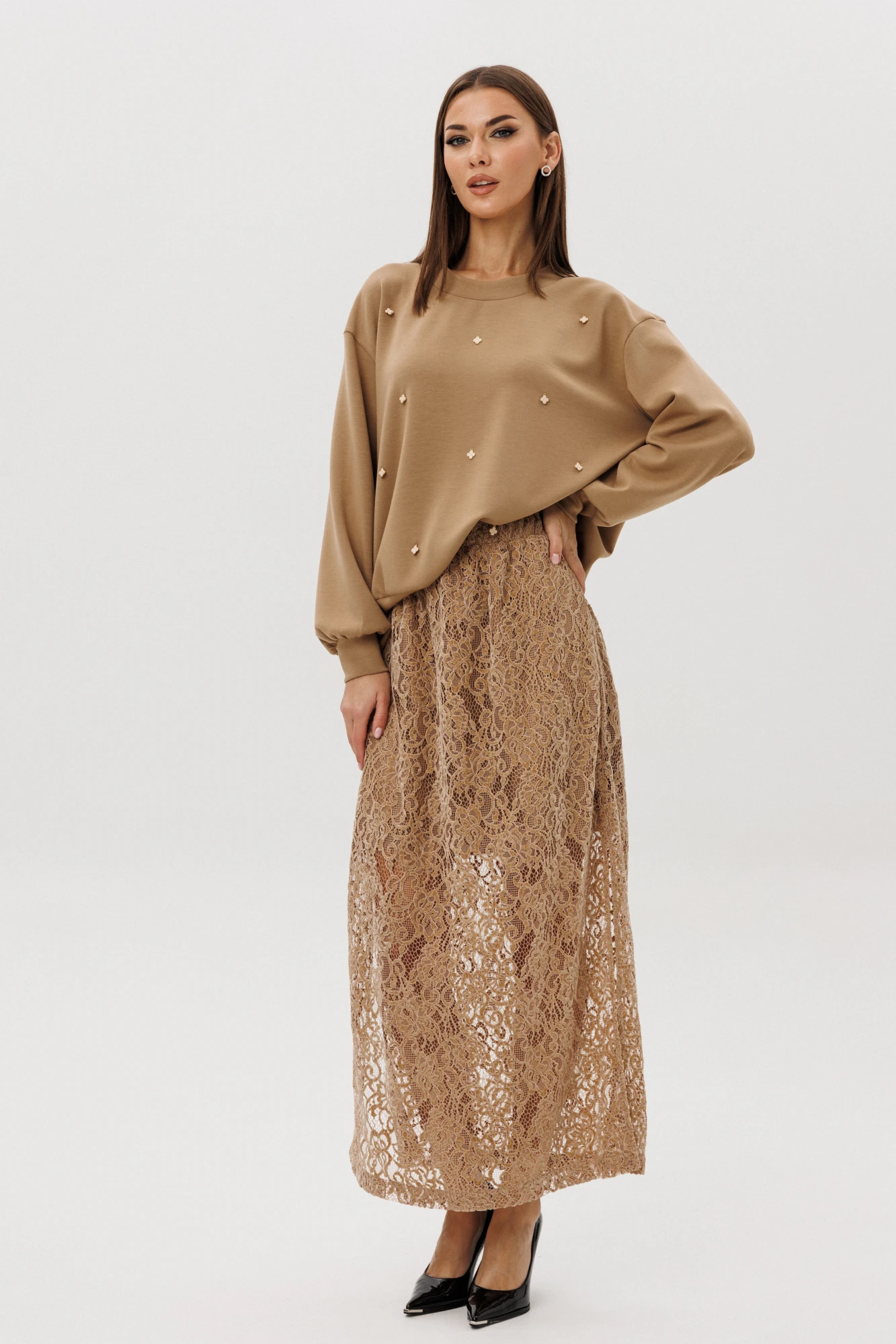 Стильный комплект, сочетающий уют и женственность. Мягкий свитшот из комфортного трикотажа украшен ручной расшивкой декоративными элементами в форме «клевера» — утончённая деталь, создающая акцент на естественной элегантности. Юбка выполнена из трендового шенилового гипюра с укороченной подкладкой, что придаёт образу лёгкость и современную многослойность.