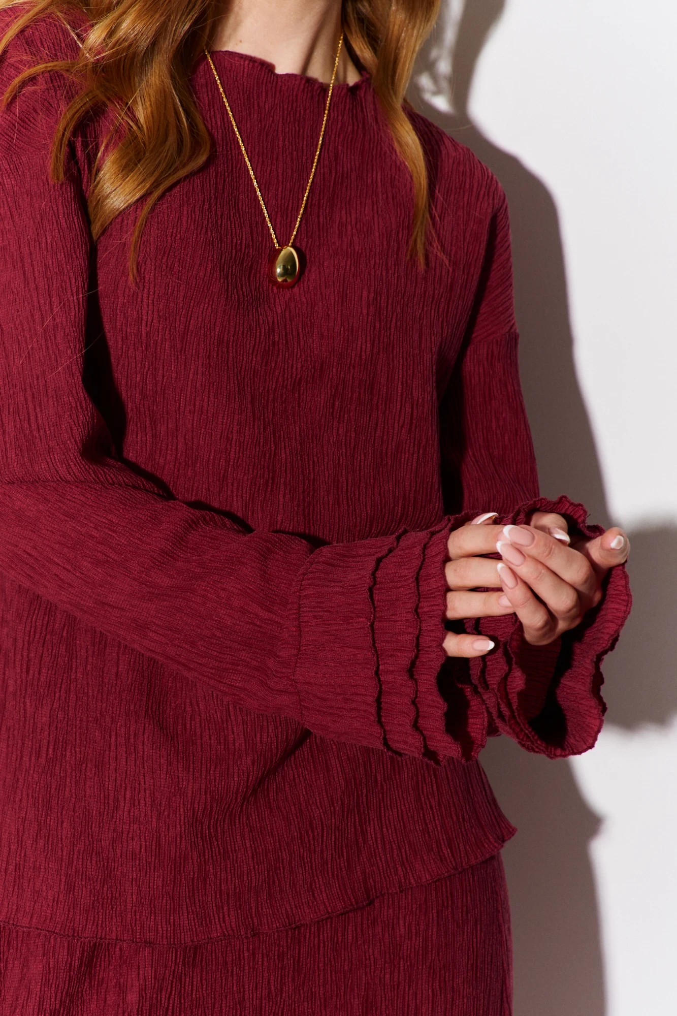 Комплект джемпер с юбкой. Характеристики: юбка выполнена из плательной ткани в цвете бургунди, верх юбки обработан эластичной тесьмой. Длина юбки 96 см. Джемпер свободного силуэта со спущенным рукавом. Характеристики: выполнена из плательной ткани в цвете бургунди, по низу рукава декоративные рюши. Длина джемпера по переду 66 см, длина рукава 55 см.