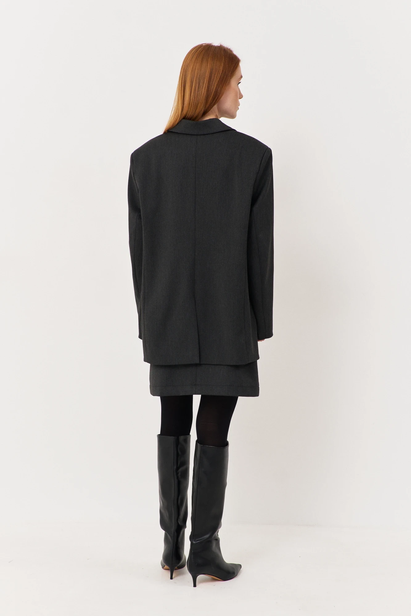 Костюм двойка: жакет двубортный с юбкой. Жакет свободного кроя. Характеристики: выполнен из костюмной ткани в серо-графитовом цвете, двубортная застежка на петли и пуговицы, жакет на подкладке, функциональные карманы с клапаном, нагрудный карман-иммитация, по спинке разрез-шлица, рукава двухшовные. Длина жакета по переду 79 см, длина рукава 63 см. Юбка прямого силуэта. Характеристики: выполнена из костюмной ткани в серо-графитовом цвете, юбка на подкладке, застежка-молния по заднему полотнищу юбки, верх юбки обработан поясом-обтачкой. Длина юбки 50 см.