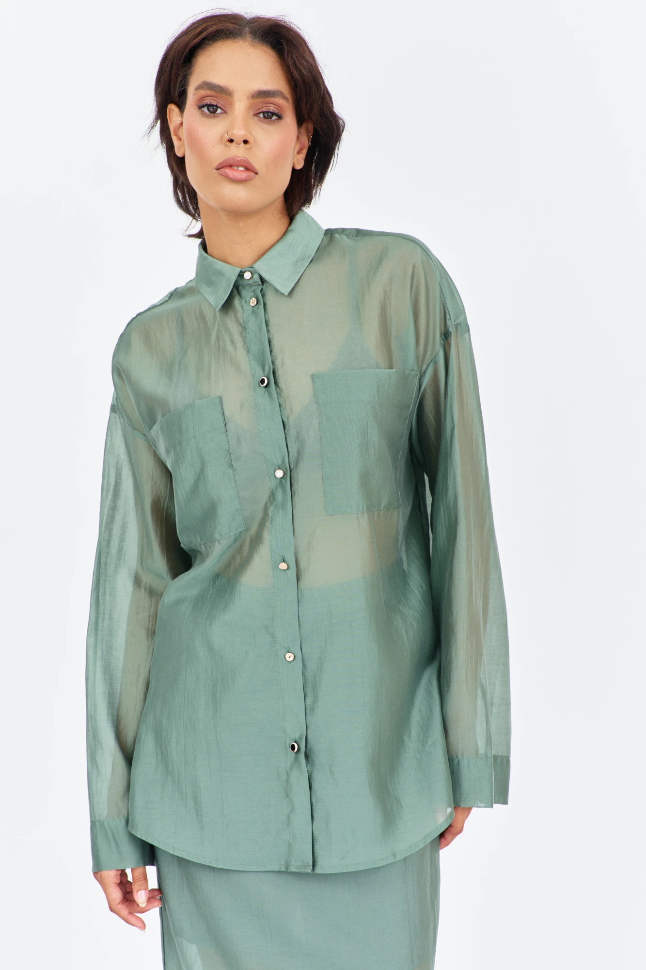 Комплект блузка свободного силуэта с юбкой. Характеристики: выполнена из блузочной ткани в цвете зеленый мох, центральная застежка на петли и пуговицы, по переду карманы, по спинке отрезная кокетка. Длина рубашки по переду 79 см, длина рукава 53 см. Юбка выполнена из блузочной ткани в цвете зеленый мох, пояс обработан эластичной тесьмой (резинкой), по заднему полотнищу юбки обработан разрез. Длина юбки по боковому шву 95 см.