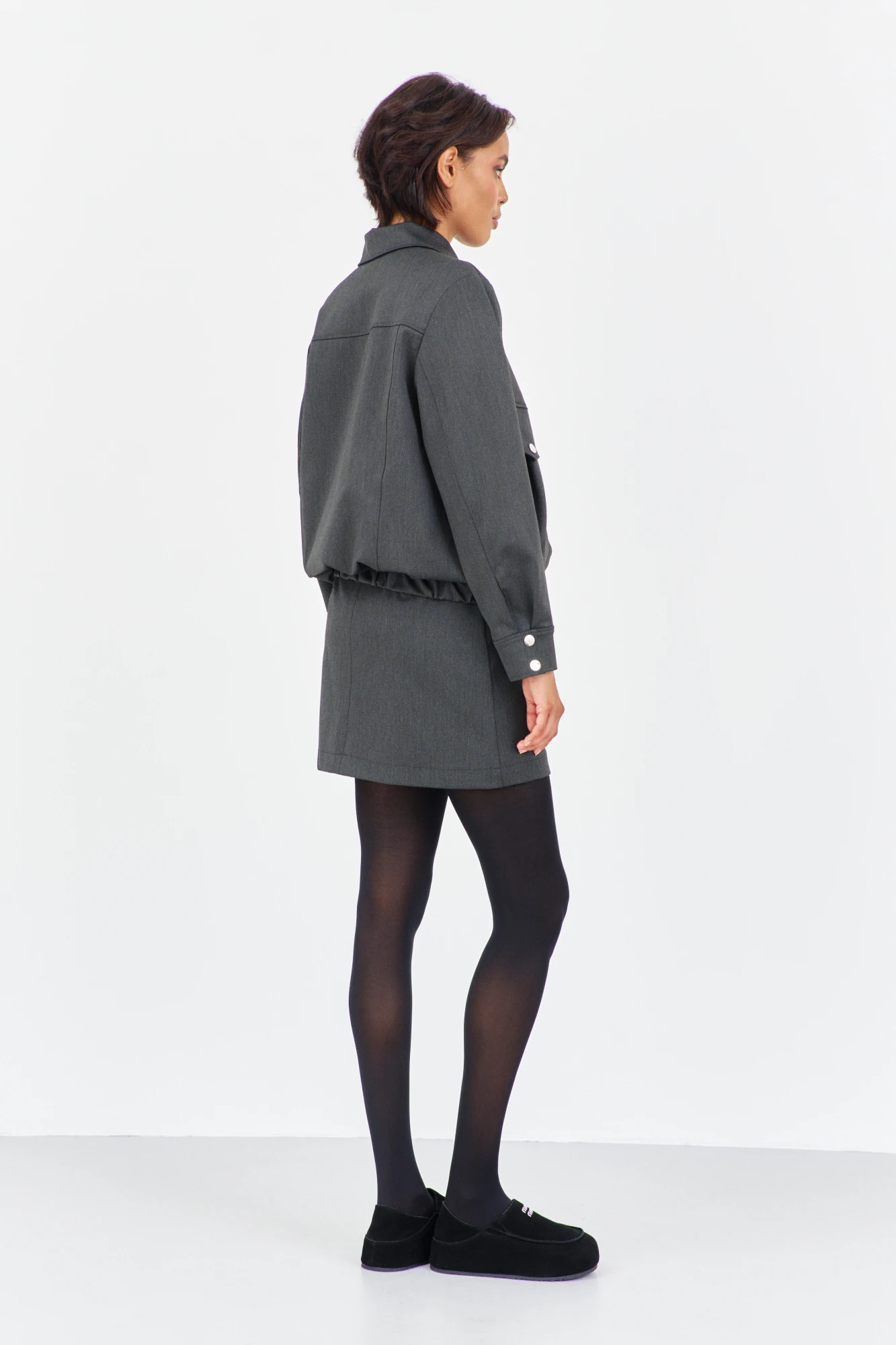 Комплект бомбер с юбкой в цвете графит. Характеристики: бомбер выполнен из костюмно-плательной ткани в цвете графит, по переду карманы-портфели с клапаном, застежка на молнию и кнопки, низ рукава и бомбера на резинке, воротник рубашечного типа. Юбка А-силуэта. застежка на потайную молнию, верх юбки обработан притачным поясом. Длина бомбера 66 см, длина рукава 62 см. Длина юбки 50 см.
