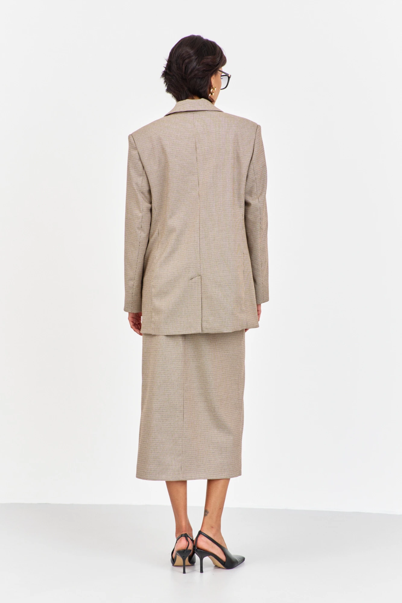 Костюм жакет с юбкой. Жакет свободного кроя. Характеристики: выполнен из костюмной ткани в принте"гусиная лапка" капучино, однобортная застежка на петли и пуговицы, жакет на подкладке, накладные карманы с клапанами, по спинке разрез-шлица, рукава двухшовные.