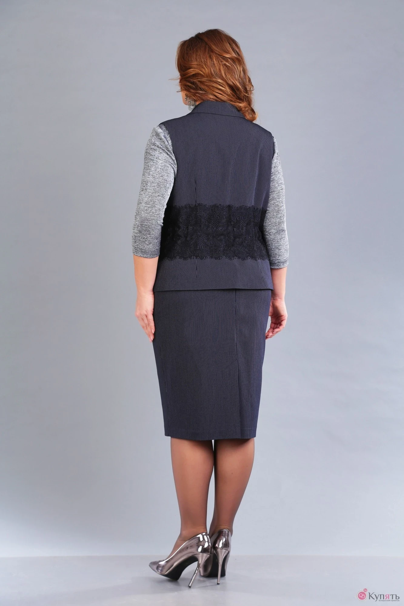 Нарядно-повседневный костюм, состоящий из жилета, юбки и гольфа. Жилет полуприлегающего силуэта на подкладке с потайной застежкой на пуговицы и петли, по талии отделка кружевом с кулисой. Юбка карандаш на поясе с подкладкой, застежка-молния и шлица по спинке. Гольф прямого силуэта со втачными рукавами.