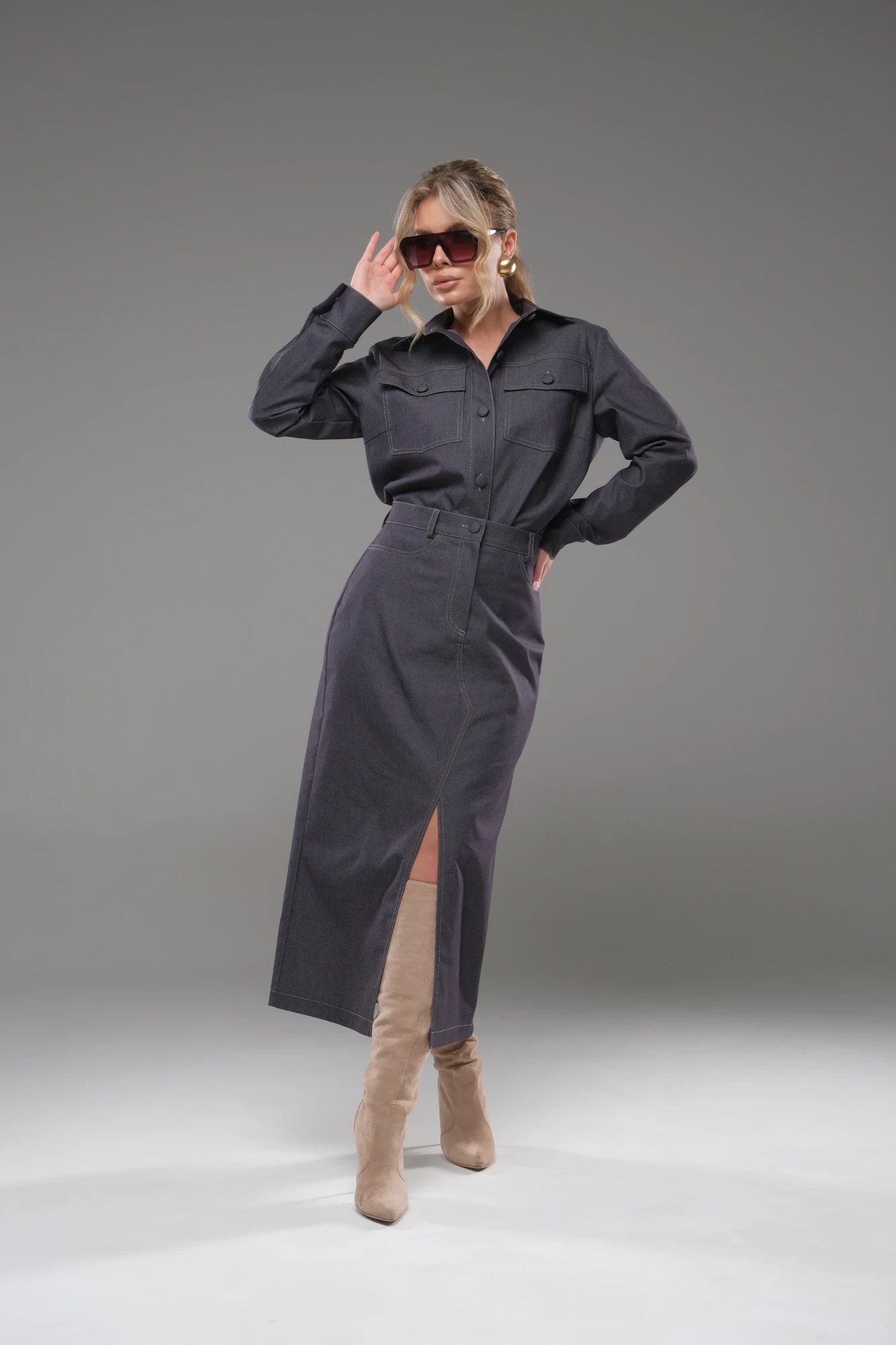 Юбка  прямая с карманами, спереди застёгивающиеся на молнию. По поясу расположены шлевки.На переде обработан декоративный шов, заканчивающийся разрезом.