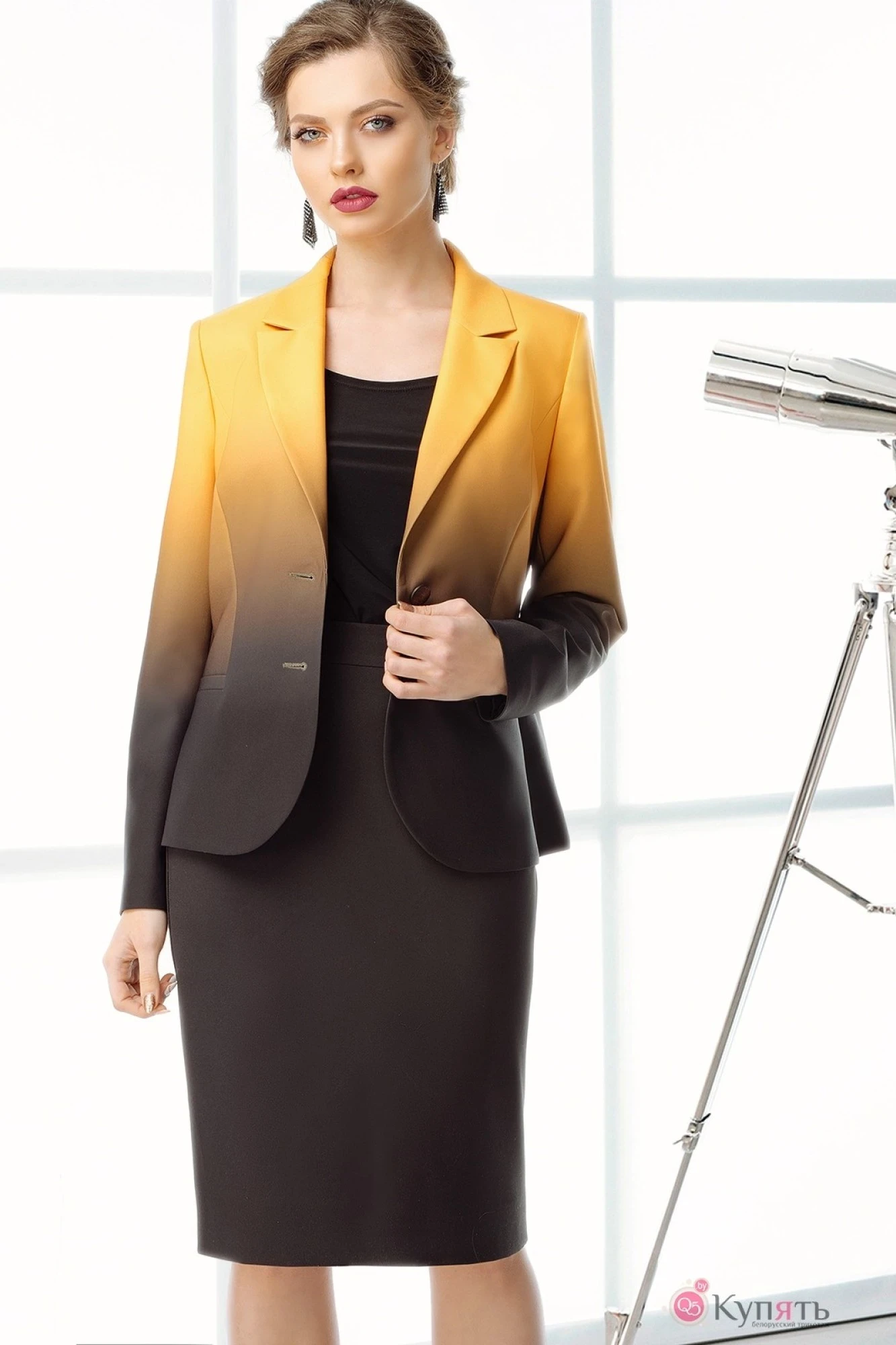 Костюм женский полуприлегающего силуэта. Жакет полуприлегающего силуэта с центрально бортовой застёжкой на две петли пуговицы. На полочке обработаны листачки. Воротник пиджачного типа с лацканами. Спинка разрезная с талиевыми вытачками. Жакет на подкладке. Юбка силуэта карандаш, заднее полотнище со средним швом с застёжкой на потайную молнию и шлицей по низу. Топ полуприлегающего силуэта на бретелях.