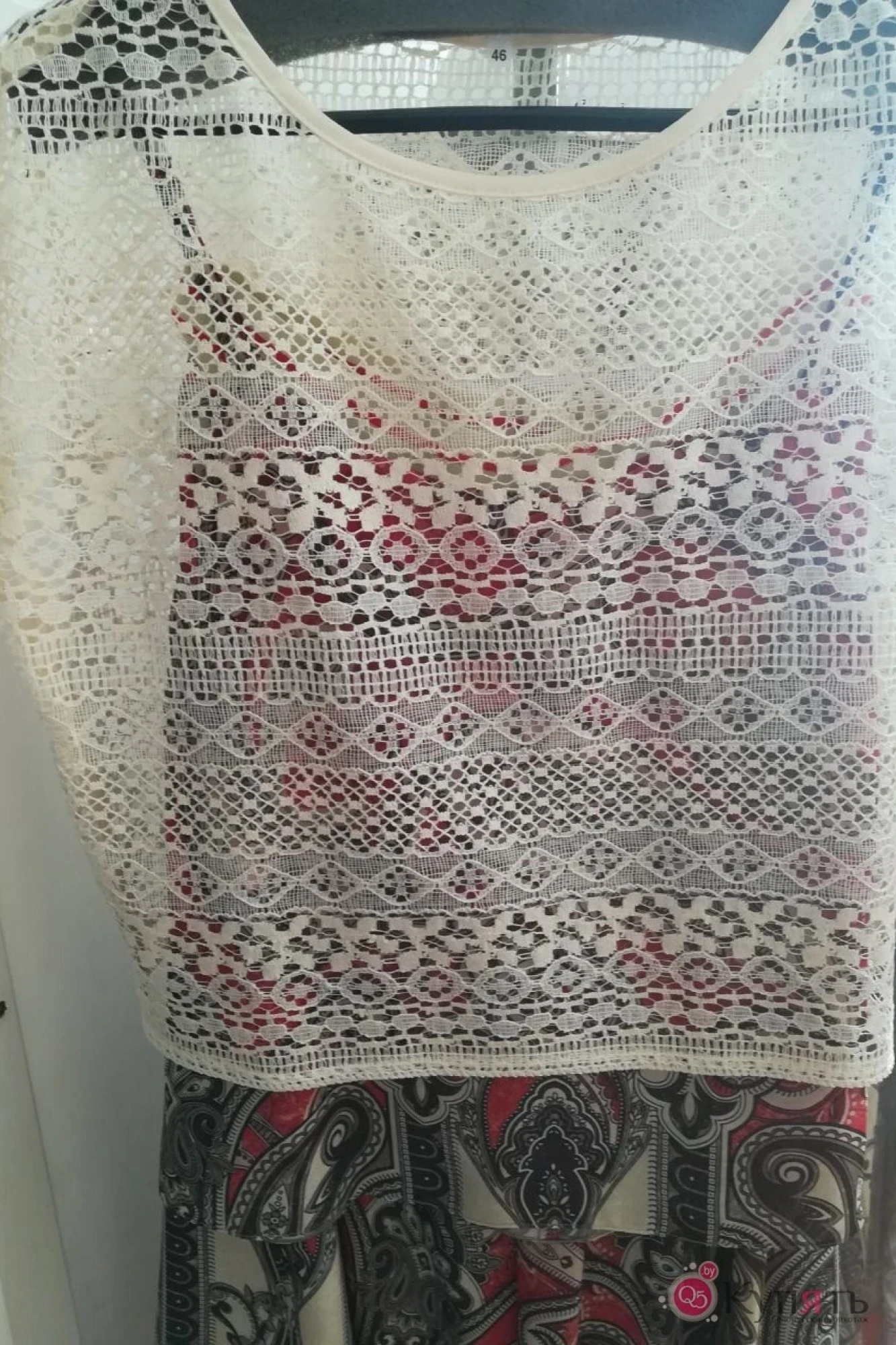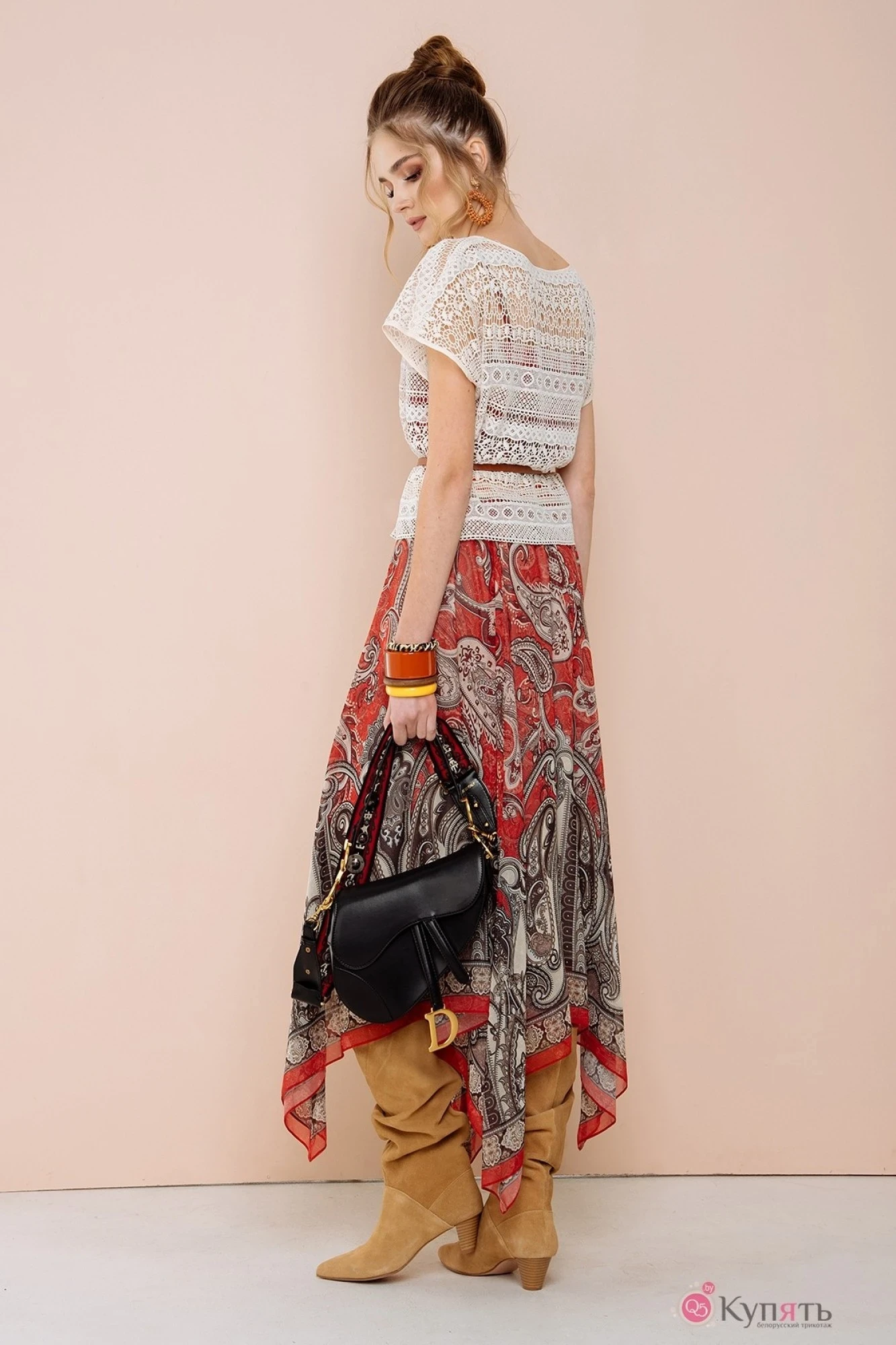Костюм состоит из блузки топа и длинной шифоновой юбки. Блузка со спущенным плечом из красивого кружевного полотна. Горловина, проймы и боковые швы окантованы. Топ из шифоновой ткани, на регулируемых бретелях. На полочке две нагрудные вытачки. В боковом шве потайная молния. Спинка со средним швом и двумя талевыми вытачками Юбка состоит из трех поперечных воланов. Юбка на подкладке, верх юбки обработан декоративной резинкой. В комплекте ремень.