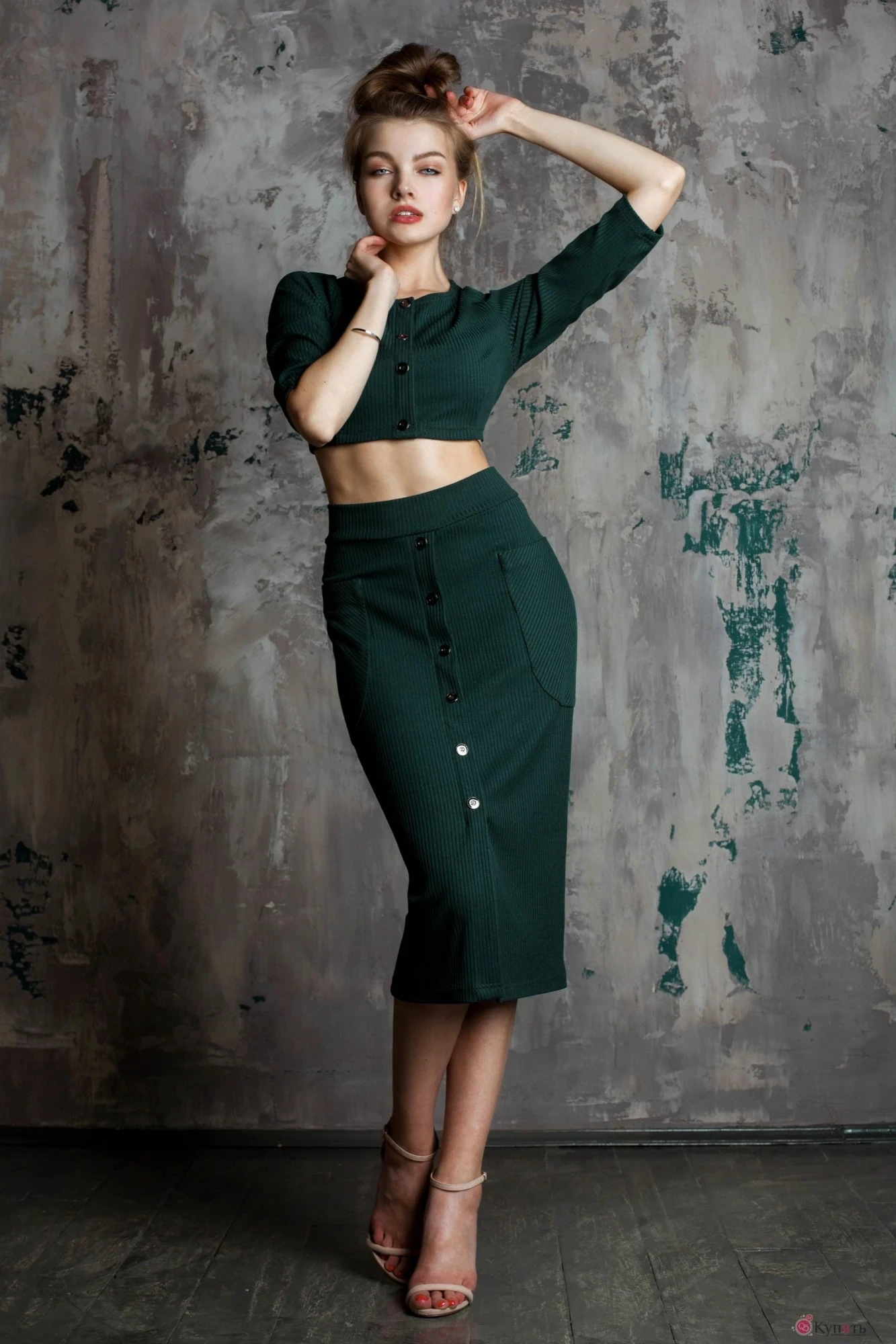 Костюм из трикотажной ткани, состоит из топа и юбки. Топ прилегающий с рукавом чуть ниже локтя, узкий. По переду имитация застежки на планку. Юбка приталенная зауженная к низу, с настрочными карманами по переду и широким поясом. Планка-застежка по переду имитирована.