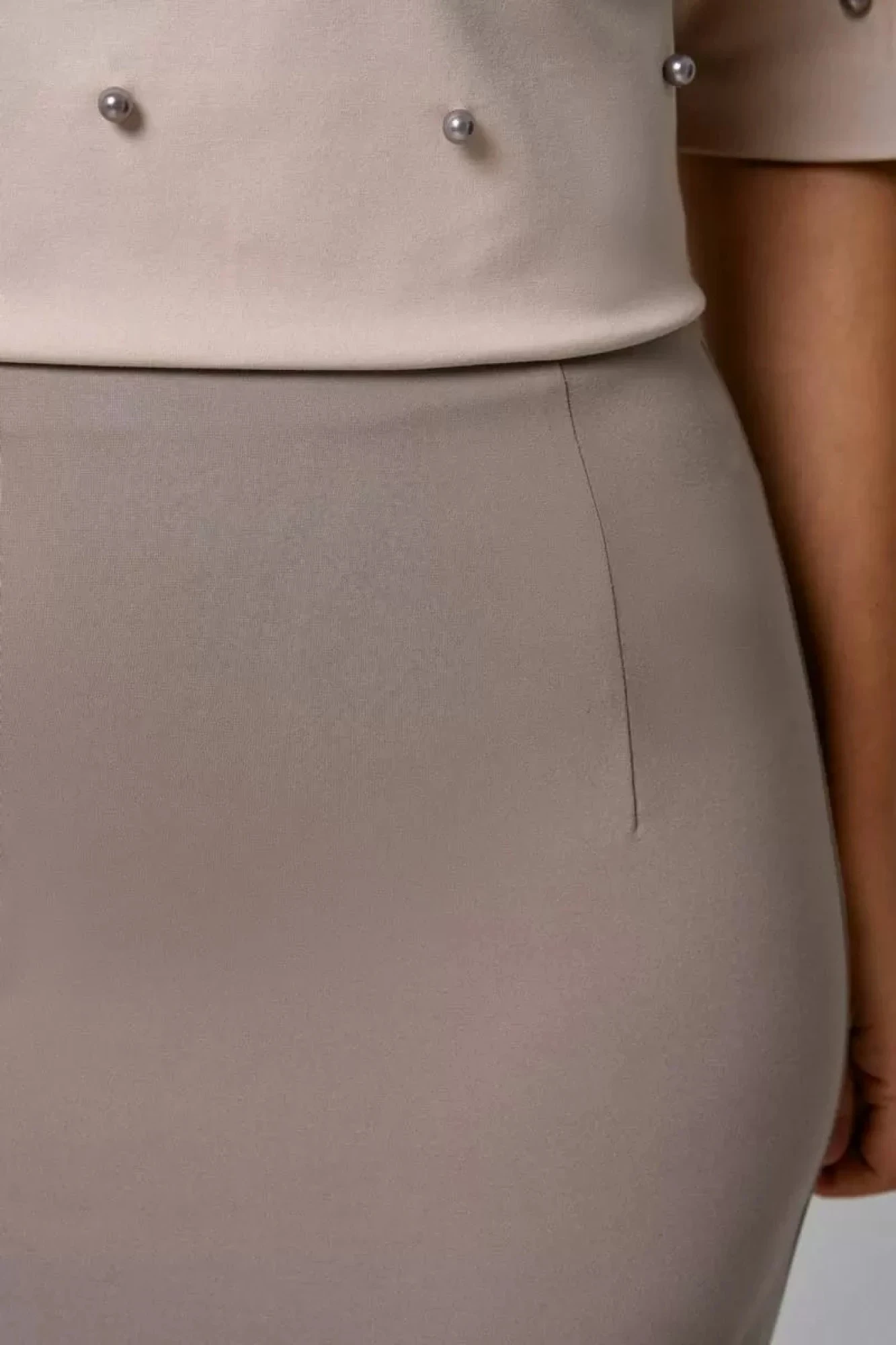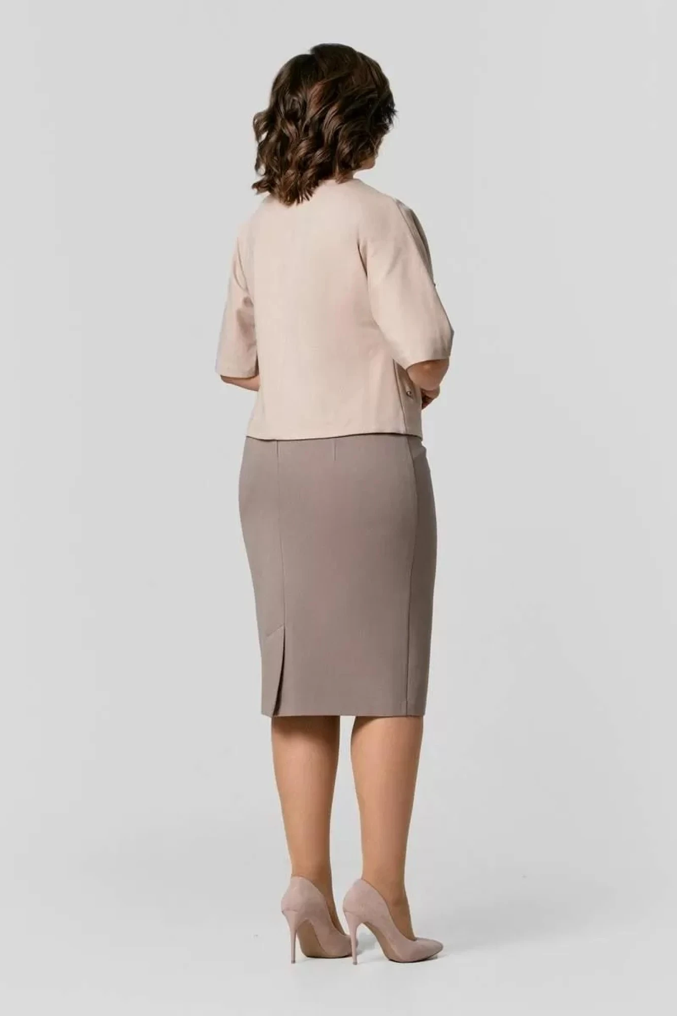 Костюм женский, состоящий из джемпера и юбки. Джемпер полуприлегающего силуэта, из трикотажного полотна средней плотности, рукава цельнокроеные; застежка на молнию по спинке, по переду декоративные бусины - жемчуг. Юбка полуприлегающего силуэта на подкладке с антистатическим эффектом; с завышенной линией талии, на поясе- обтачке, по спинке застежка на молнию, внизу шлица.
