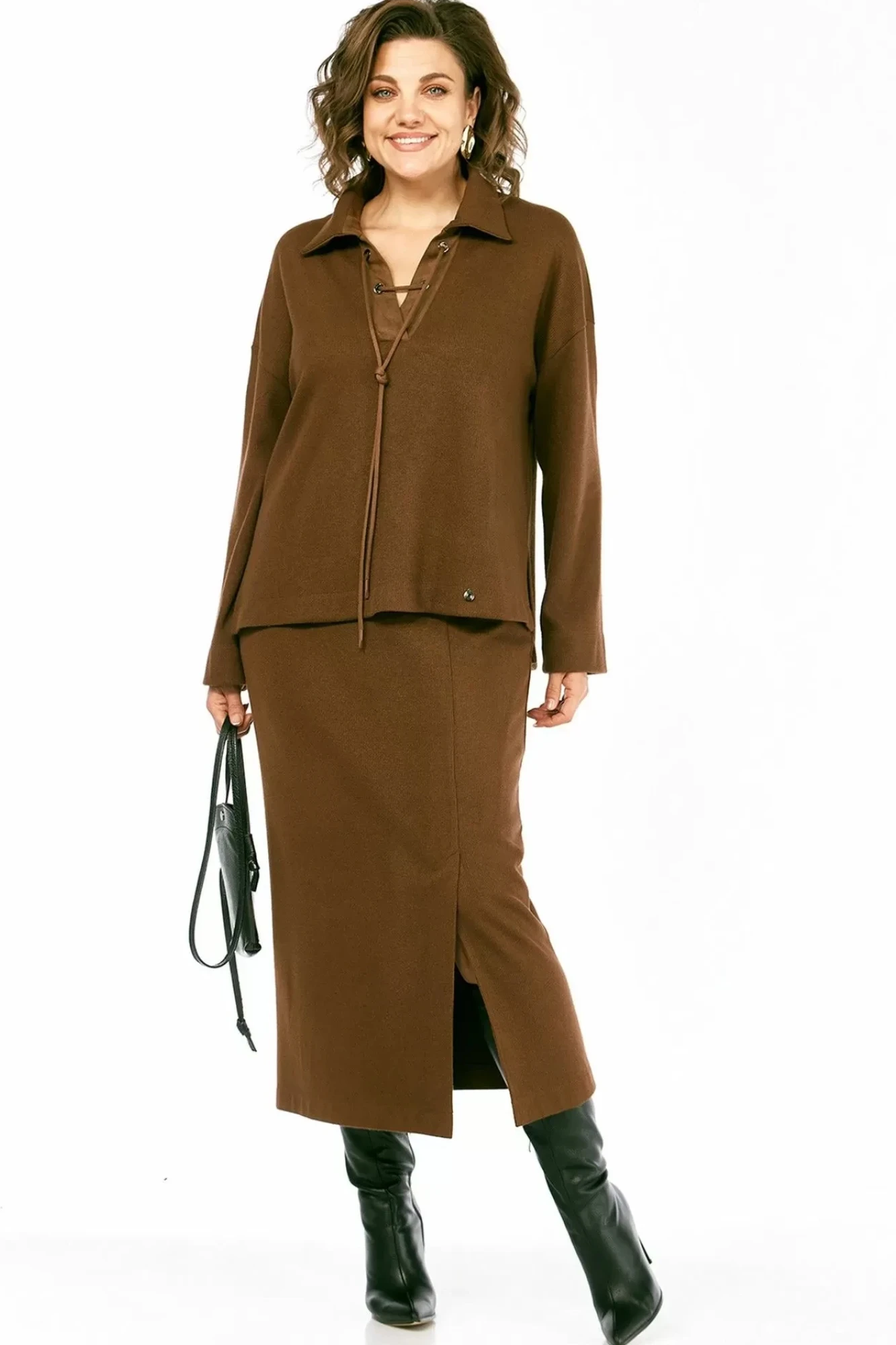 Костюм женский, юбочный, изготовлен из трикотажного полотна, состоит из джемпера и юбки. Джемпер свободного кроя. Горловина оформлена отложным воротником на стойке и планками, декорированными люверсами, с протянутым в них шнуром. Рукава спущенные, длинные. Низ изделия разной длины, в боковых швах разрезы. Кокетка спинки, планки и воротник джемпера выполнены из отделочной ткани. Юбка с цельнокроенным поясом на резинке. На передней части шов, внизу обработана шлица. Юбка на подкладке.