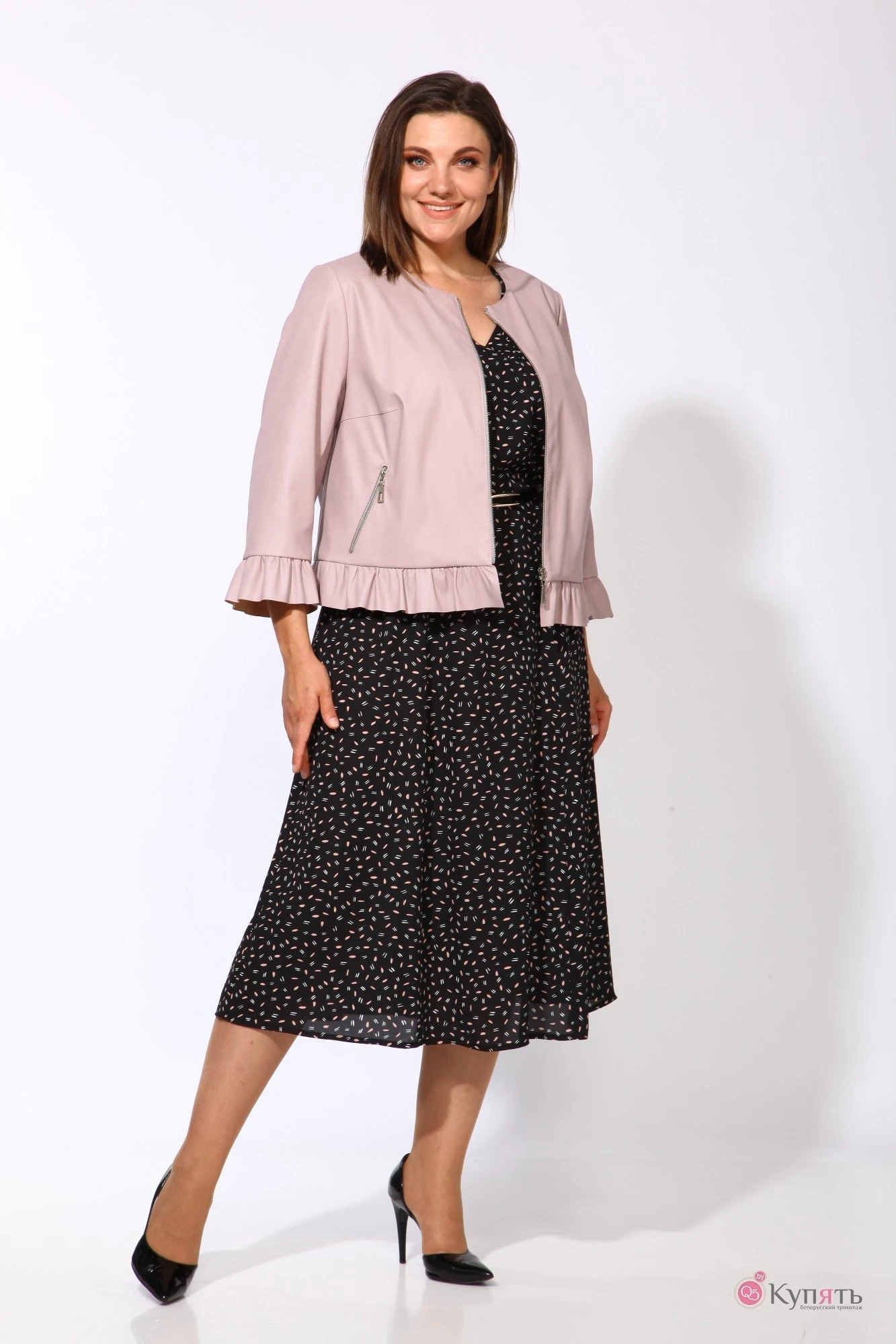 Комплект женский из куртки и платья. Курткапрямого силуэта с втачным рукавом без воротника выполнена из экокожи , с застежкой на тесьму-молнию , по переду обработаны прорезные карманы с молниями , по низу обработаны декоративные рюши .Платье полуприлегающего силуэта с рельефами по спинке и втачным рукавом с манжетой, перед отрезной с декоративной деталью.