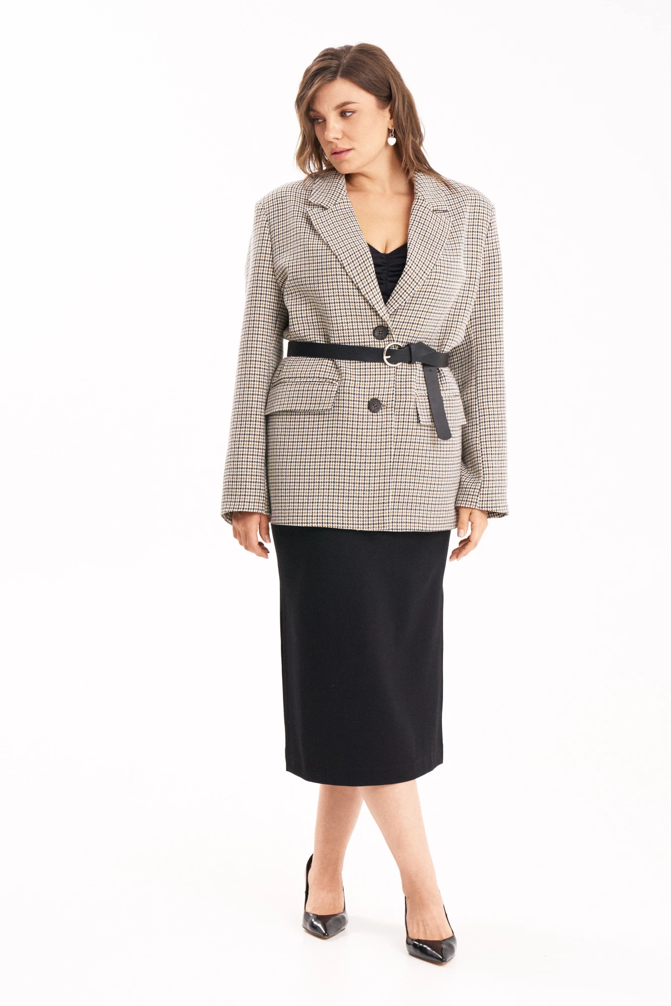 Костюм состоящий из жакета и юбки. Базовый жакет прямого силуэта с классическим воротником и лацканами с застёжкой на две пуговицы. По переду прорезные карманы в рамку с клапанами. Рукава со шлицами и пуговицами. Юбка из тонкой костюмной ткани А-образного силуэта с высоким разрезом по переду. Нижняя юбка 44 см. Застёжка на потайную молнию.Комплектуется ремнём.