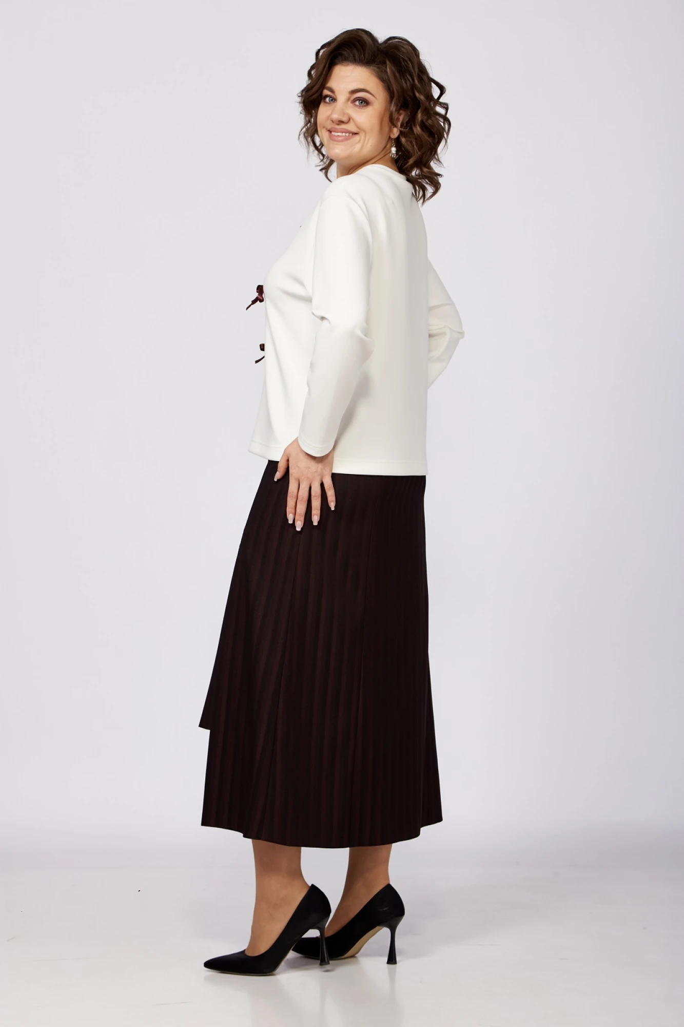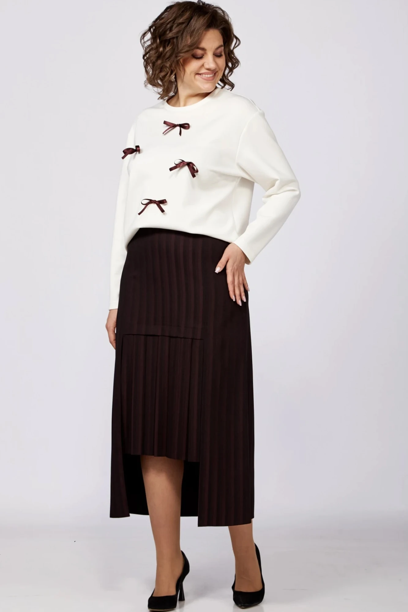 Нарядный женский комплект, состоящий из блузона и юбки. Блузон выполнен из трикотажного полотна с добавлением вискозы, свободного облегнания, вырез горловины круглый с планкой, линия плеча слегка опущена, рукав длинный. Перед блузона украшен декоративными бантиками в цвет юбки. Юбка из костюмной ткани с добавлением хопка и вискозы, удлиненная, с вертикальными рельефами по переду и спинке, отрезным поясом с резинкой и потайной застежкой-молнией в боковом шве, силуэт расширен к низу. Оригинальность юбке придает ассиметричная длина по переду за счет укороченной вставки с неглубокими складками и разрезом справа.