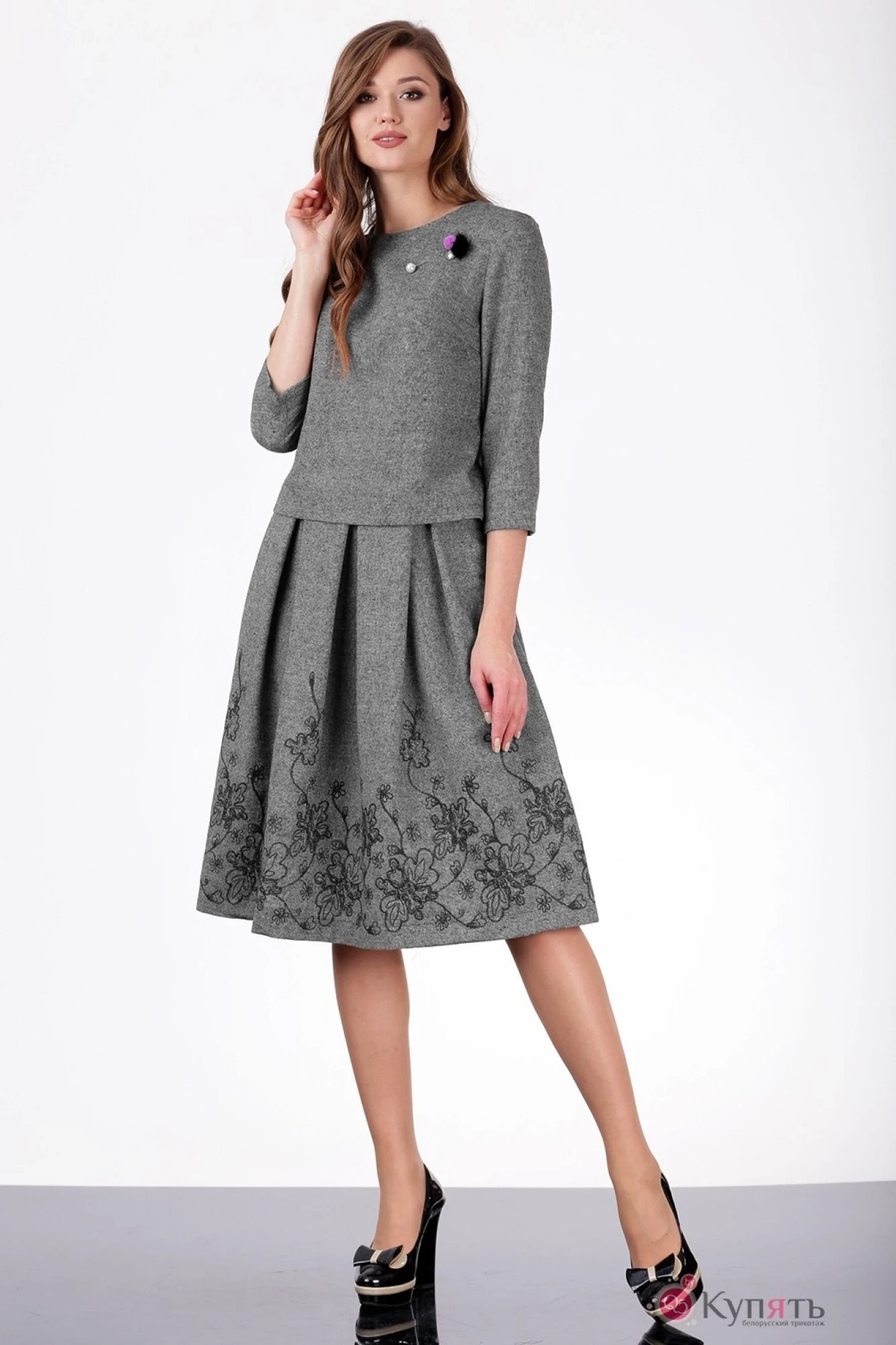 Молодежный костюм состоящий из однотонного джеспера и юбки. Джемпер с округлой горловиной и рукавом 3/4. В центральном шве спинки вставлена молния. Юбка в крупную складку, с карманами и длиной ниже колена. Благодаря хорошей плотности ткани, юбка шикарно держит форму колокольчика. Широкие встречные складки создают правильный силуэт. Карманы по бокам юбки очень удобны в использованы - это и комфортно и модно. Юбка имеет дополнительную застежку - потайную молнию по спинке. Брошь в комплект не входит