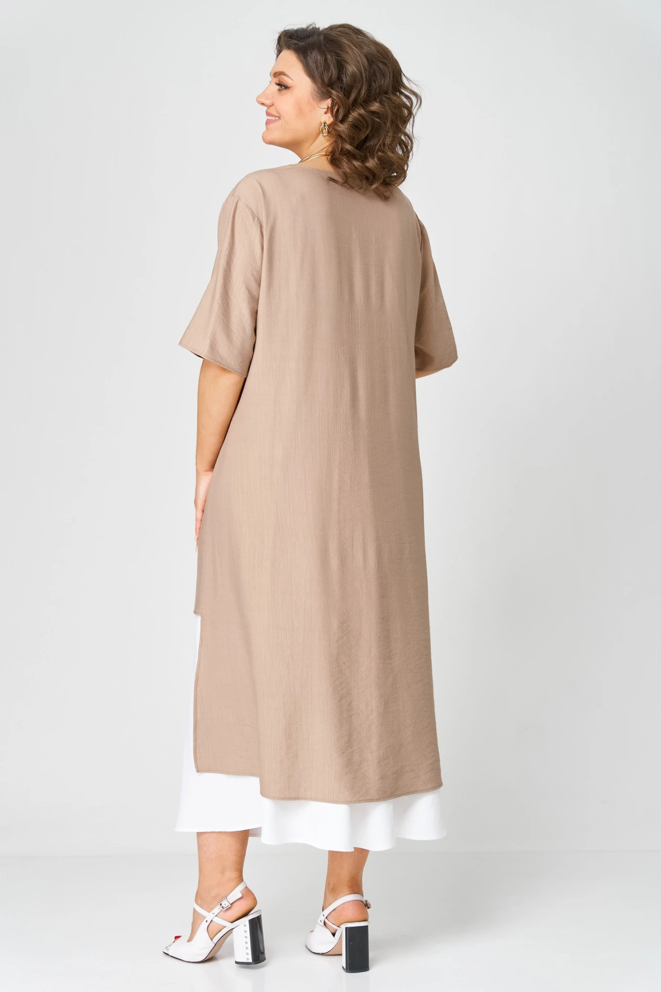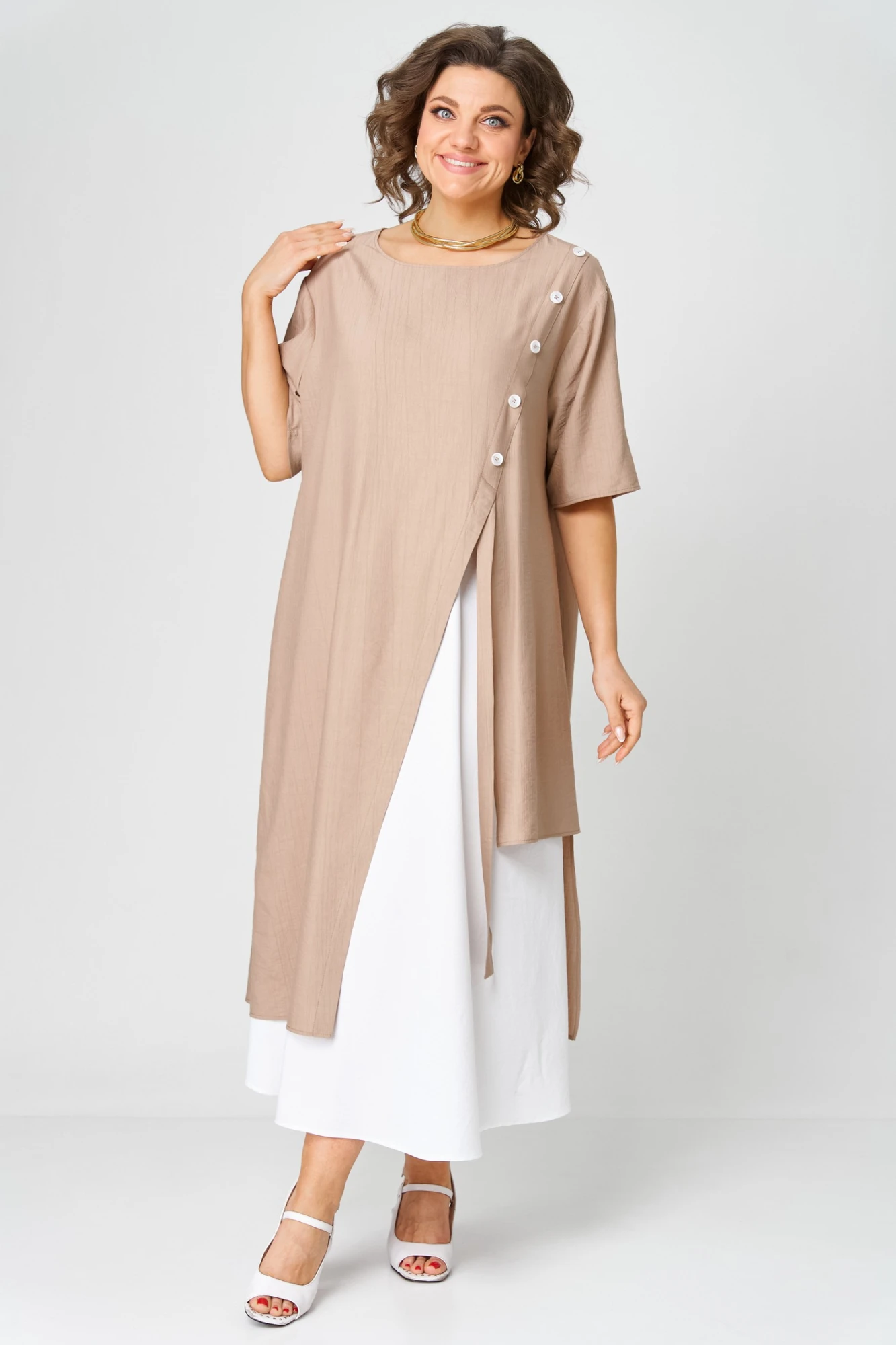 Туника длинная, свободного силуэта, расширяющаяся к низу. По полочке от плечевого шва декоративная планка с пуговицами до уровня талии, переходящая в разрез. Левая часть полочки короче правой. Вырез горловины округлый. Рукав короткий втачной одношовный.