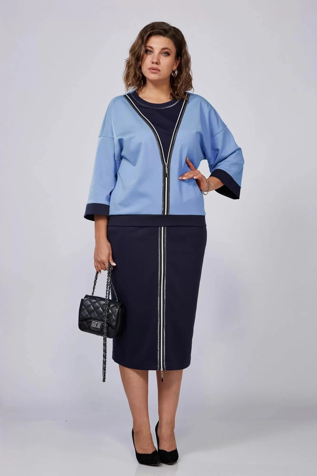 Красивый и стильный костюм в котором вы можете пойти не только на прогулку, но и ходить в нем на работу, по делам, выбираться в кино или кафе. В комплекте одежды будет комфортно осенью, весной и даже летом. Костюм состоит из элегантнной длинной юбки прямого силуэта, по переду декоративная регулируемая разрез молния, на резинке, с карманами и стильного дизайнерского джемпера средней длины с питачным поясом, рукав 3/4 на спущенной пройме с притачной мандетой, горловина округлой формы, по полочке декоративная молния делающая ваш образ интересным и запоминающимся. Этот стильный костюм выполнен из трикотажа высокого качества, станет базовой вещью вашего гардероба. Подойдет для девушек, ценящих удобство, а также комфорт, красоту и стиль.