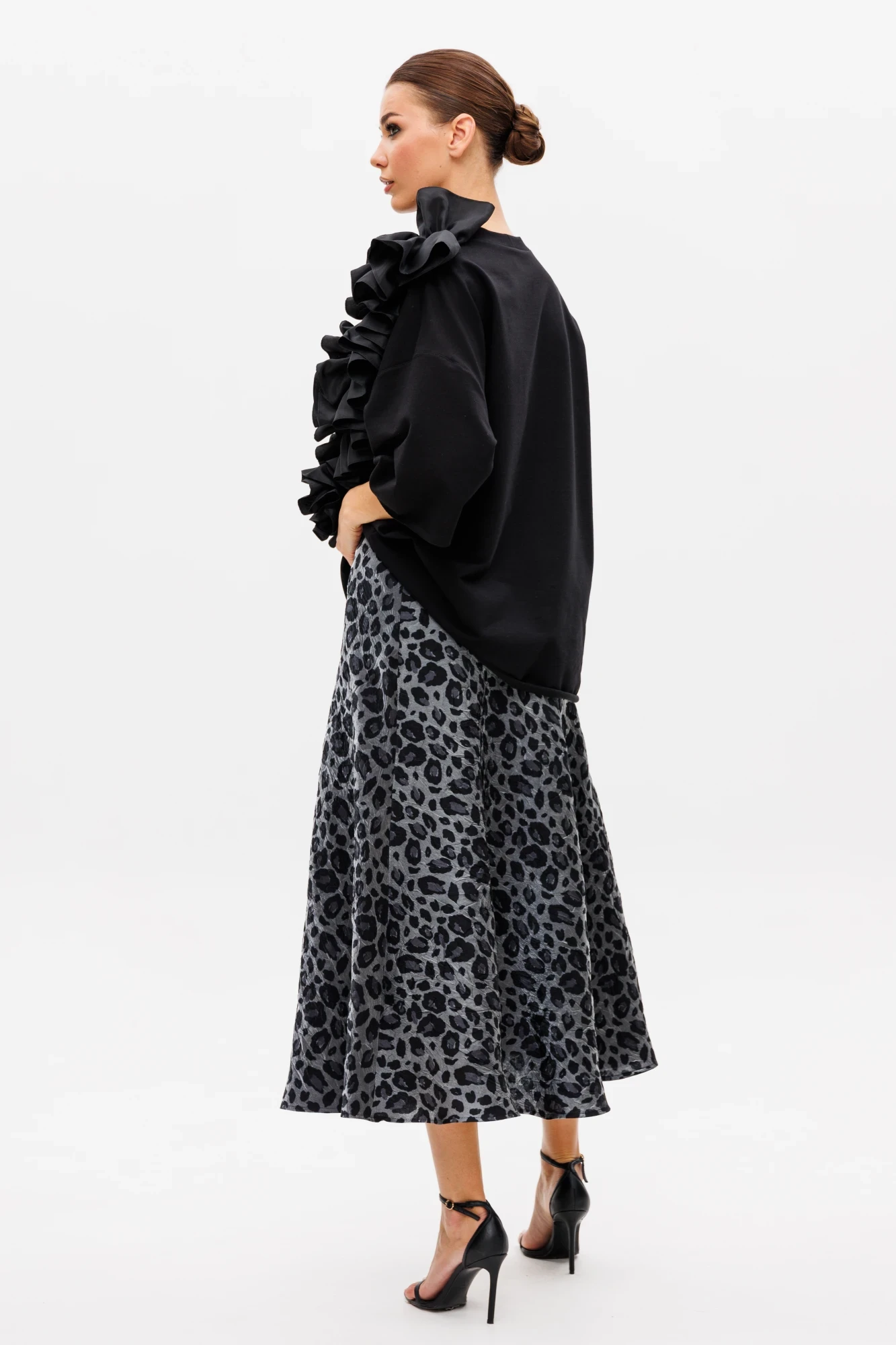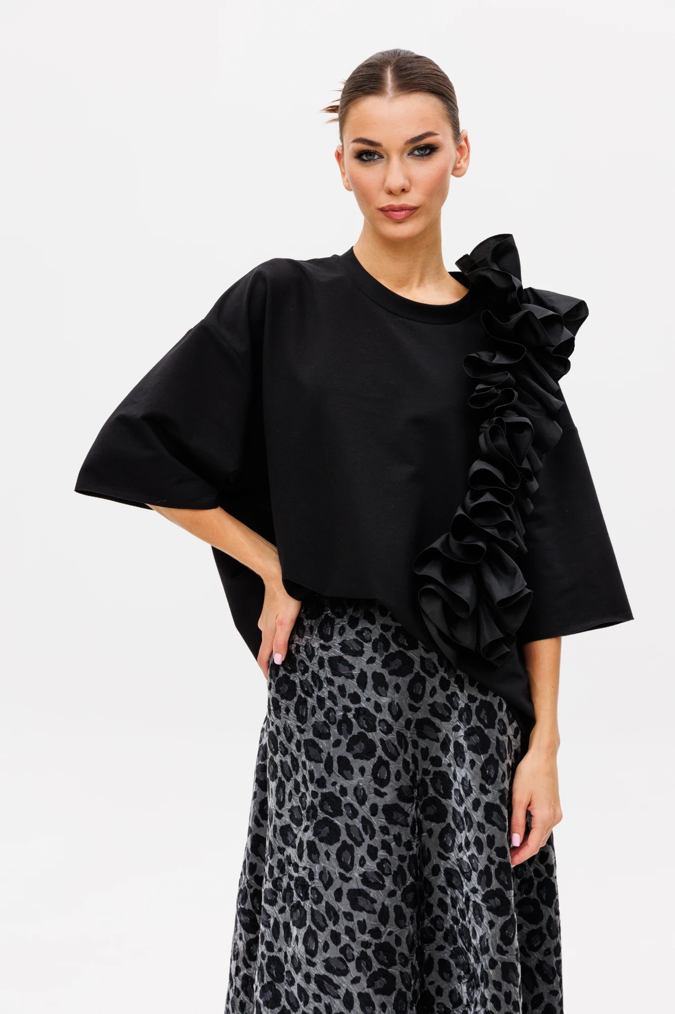 Эффектный тандем: свободный блузон с ассиметричной вертикальной рюшей и юбкой удлиненной полуклеш на подкладке.