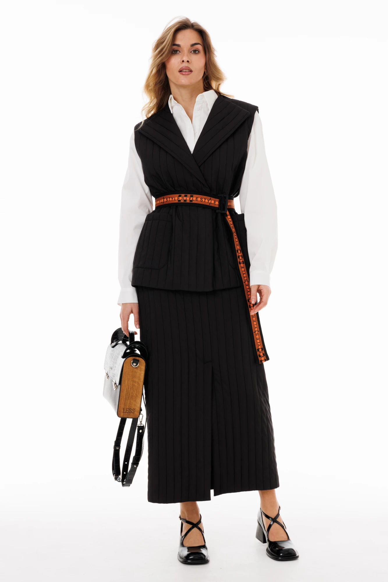 Юбка прямого силуэта из стеганого полотна, длиной 86 см. Спереди изделие состоит из двух деталей, в котором расположена разрез-шлица, высотой 42 см. В боковых швах расположены внутренние карманы. В среднем шве спинки находится потайная застежка-молния. Пояс юбки высотой 5 см с шлевочными деталями по спинке и полочке для возможной фиксации талии ремнем (ремень в комплект не входит).