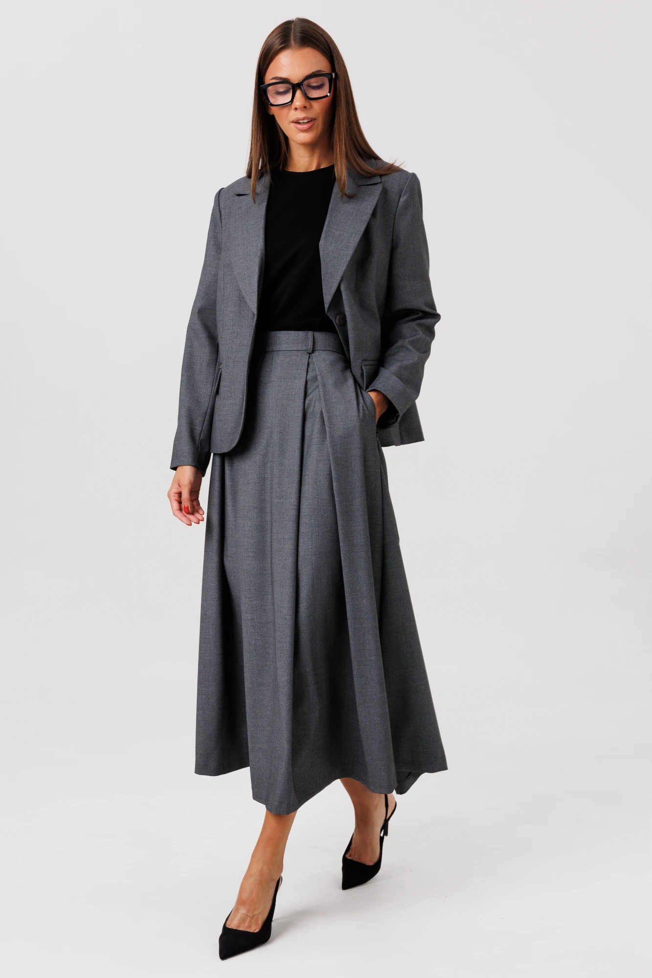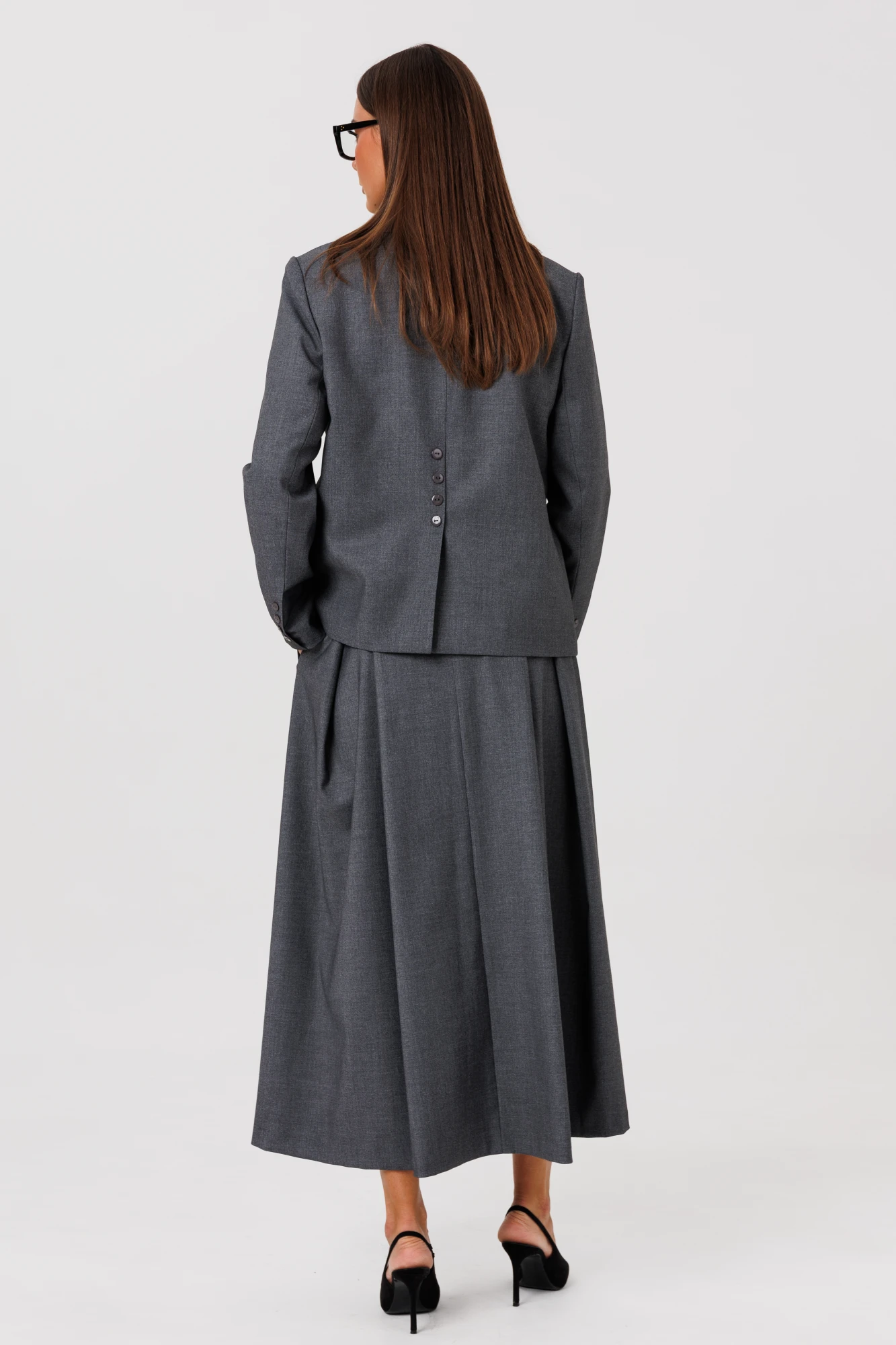 Стильный гармоничный комплект, состоящий из свободного жакета, удлиненной юбки с встречными складами и майки с коротким рукавом. Эффектной деталью комплекта выступает высокая открытая шлица на спинке жакета, закрепленная пуговицами.