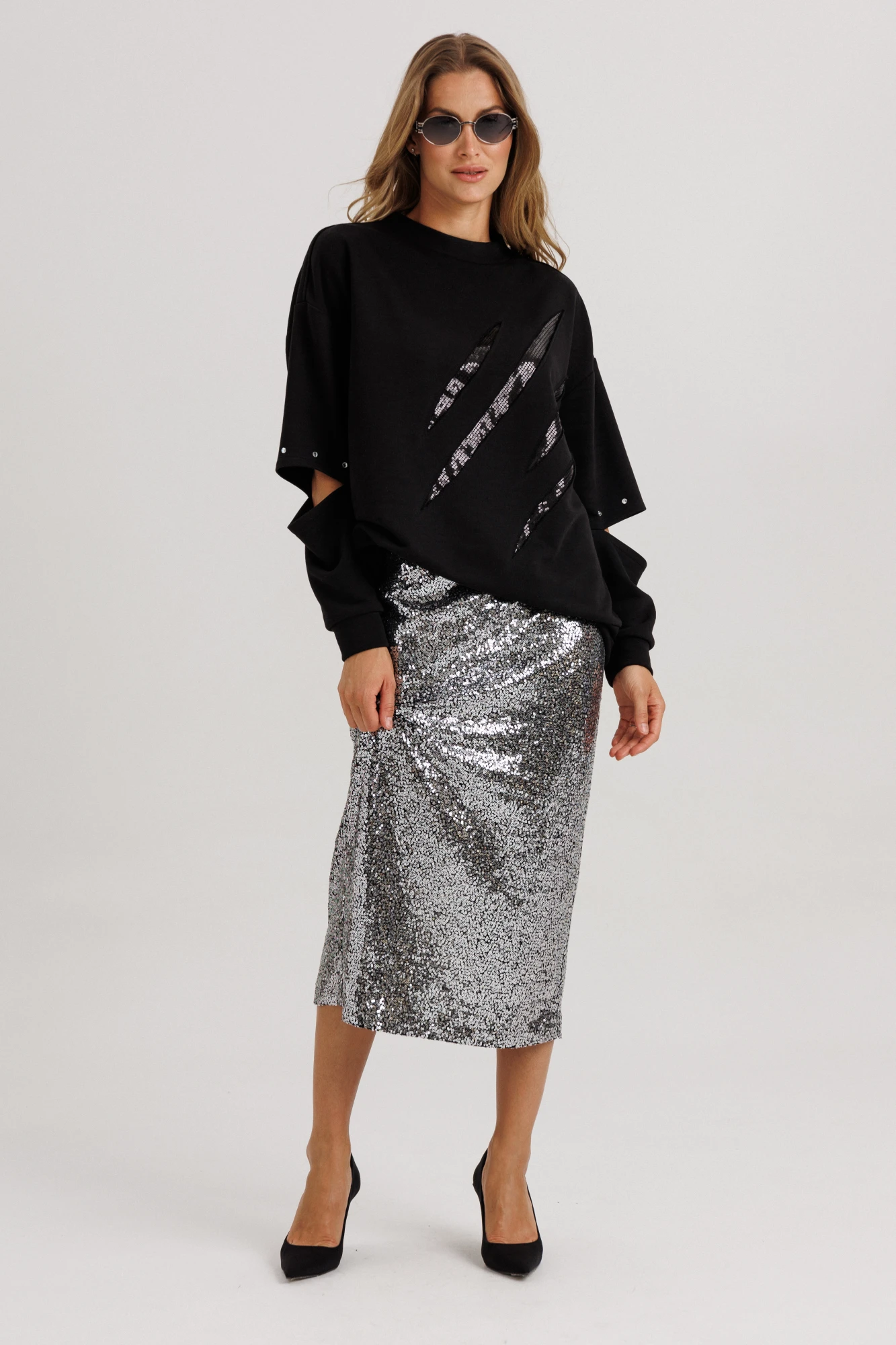 Стильный комплект, состоящий из эффектного оверсайз-блузона с декоративными вставками, рукавами-трансформерами удлиненной юбки из полотна с пайетками.