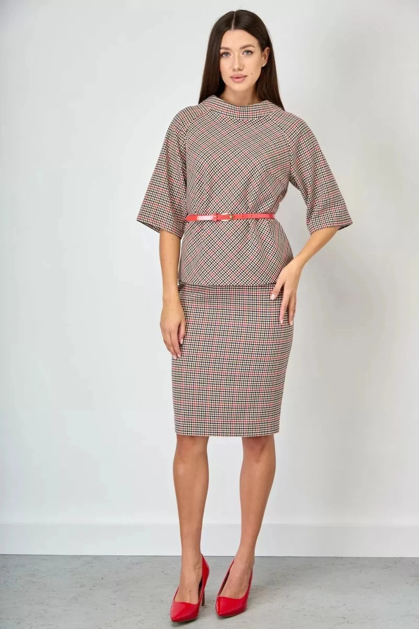 Стильный комплект, состоящий из блузона и юбки, из костюмной ткани. Блузон прилегающего силуэта, слегка расклешён к низу. Спинка со средним швом. В среднем шве спинки – потайная застёжка-молния. Длина по спинке – 56,5 см. Горловина обработана стойкой – воронкой, высотой- 3,5 см. Рукав – реглан, слегка расклешён к низу. Длина рукава – 41,5 см. Юбка прилегающего силуэта, зауженная к низу, по среднему шву – потайная застёжка на тесьму – молнию, в низу – разрез. Верхний край обработан обтачкой. Длина юбки по боковому шву – 64 см. Юбка на подкладке. Декор – ремень, может отличаться от заявленного на фото.