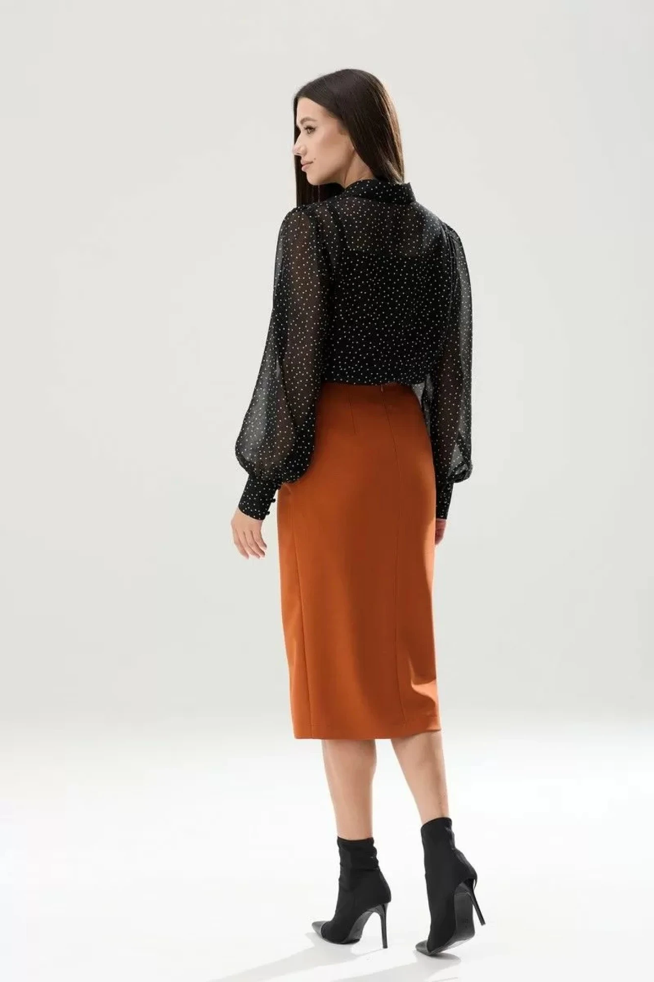 Стильный комплект, состоящий из воздушной блузки из шифона, женственного топа и обегающей юбки-миди с разрезом спереди. Блуза прямого силуэта с рубашечным воротником на стойке и пышным рукавом у оката и сборкой на манжете. Спереди расположены на функциональной планке петли-пуговицы. В боковых швах имеются разрезы. Рукав предполагает напуск, длину рукава определяет объем прилегания манжет. Топ выполняет функцию бельевой комбинации и защищает шифоновую блузу от прозрачности. Топ прямого силуэта, с нагрудными вытачками, на тонких бретелях. Юбка-миди облегающего силуэта на подкладке и поясе-обтачке. Спереди в вертикальном шве расположен разрез, высотой 33 см. Сзади, в среднем шве расположена застежка-молния. По линии талии переднего и заднего полотнища юбки расположены вытачки. Длина юбки 73 см.