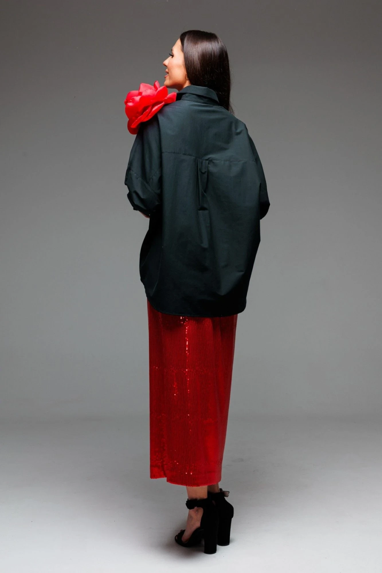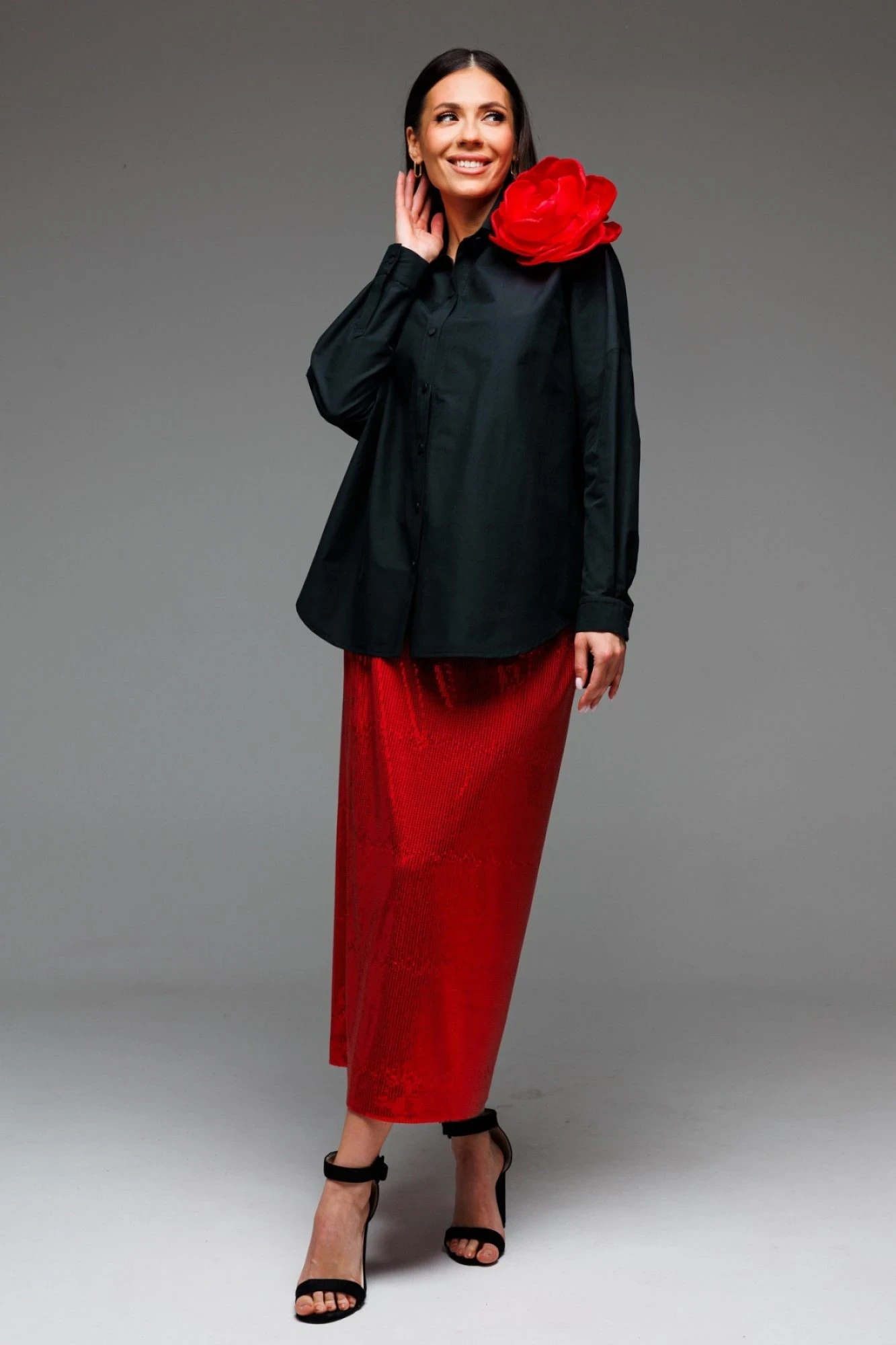 Стильный комплект, состоящий из рубашки, гламурной длинной юбки из пайеток и брошь-декора.