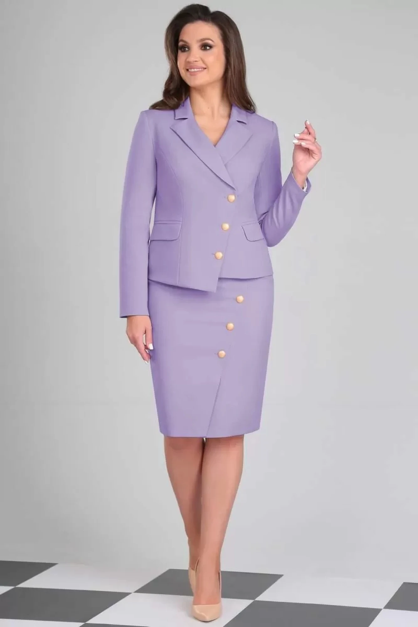 Комплект женский состоящий из жакета и юбки. Жакет полуприлегающего силуэта на подкладке. По переду и спинке фигурные рельефы, в рельефах переда функциональные карманы в рамку с клапаном. Застежка асимметричная (сверху двубортная, снизу однобортная) бортовая застегивающаяся на петли и декоративные пуговицы. Воротник пиджачного типа. Рукав втачной, двухшовный, длинный. Низ изделия фигурный с выступом у застежки. Юбка полуприлегающего силуэта на подкладке, зауженная к низу, на обтачке( без пояса). По переду асимметричный подрез имитирующий застежку с петлями и декоративными пуговицами. В подрезе переда шлица, застежка на потайную тесьму-молнию в левом боковом шве.