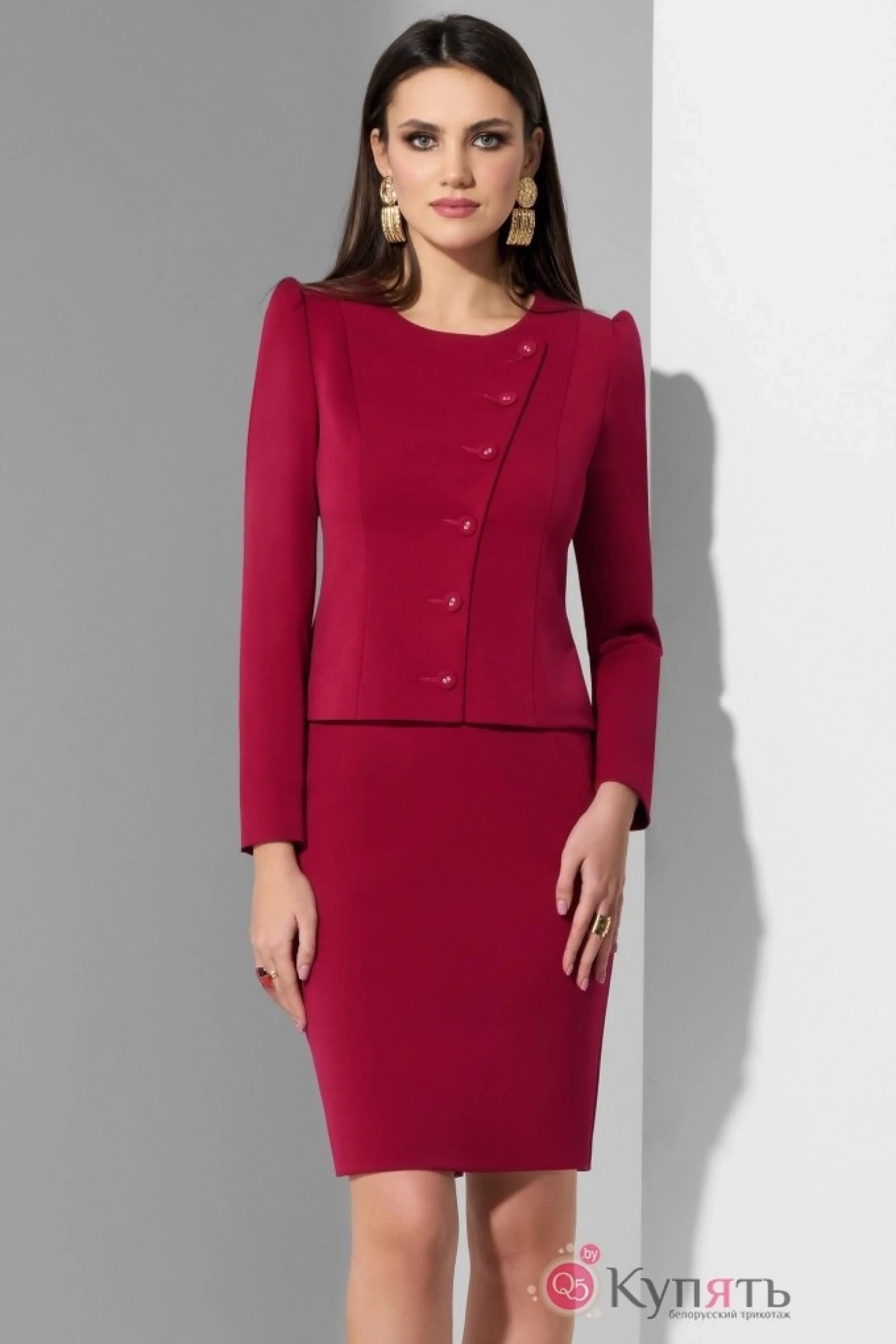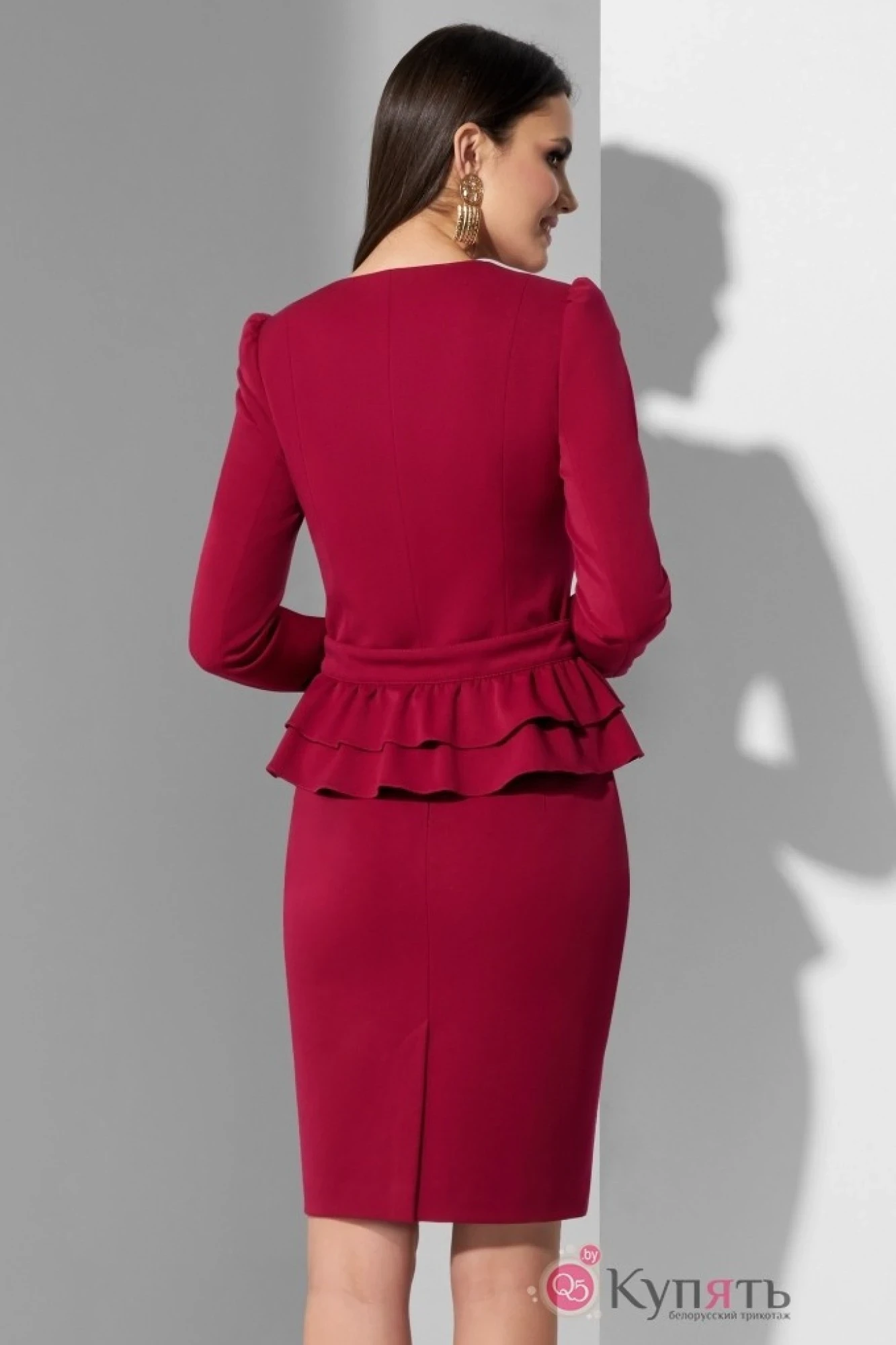 Жакет с округлым вырезом горловины, ассиметричной застёжкой на петли и пуговицы и съёмным поясом с воланами. Перед с двумя рельефами. Спинка со средним швом и двумя рельефами. Рукава втачные со сборкой по окату. Жакет на подкладке. Юбка на поясе. Заднее полотнище с потайной молнией и шлицей в среднем шве. Юбка на подкладке. Длина жакета по спинке – 50см, длина рукава – 62см. Юбка вдоль середины переднего полотнища – 51.5см