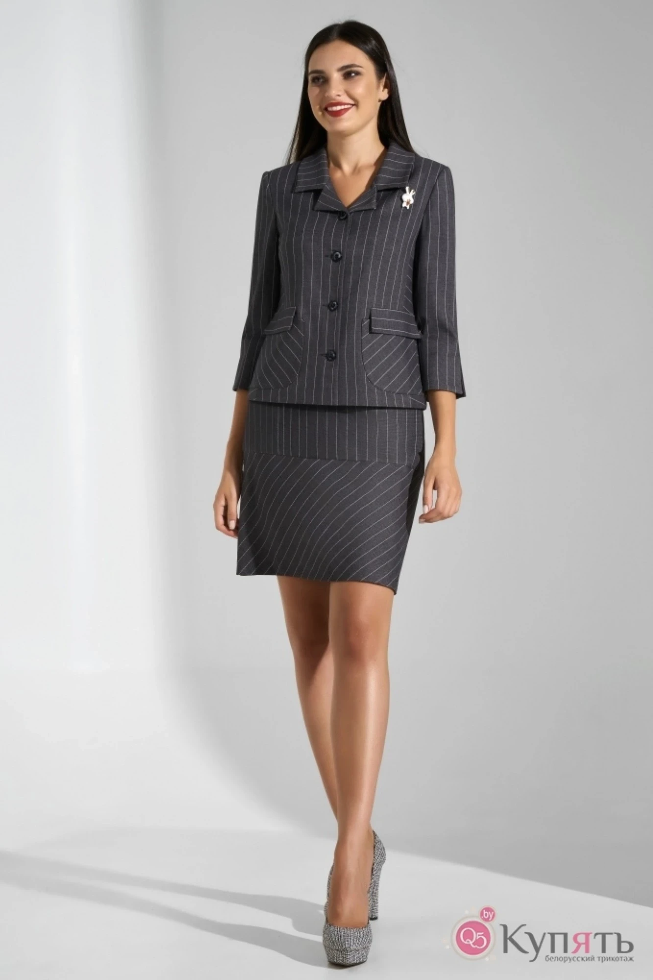 Костюм юбочный Жакет со стояче отложным воротником и центральной застёжкой на петли и пуговицы. По переду в нижней части накладные карманы с клапанами. Спинка со средним швом и двумя рельефами. Рукава втачные с разрезом по низу. Жакет на подкладке. Брошь входит в комплект (вид может меняться). Юбка с отрезной деталью по низу. Заднее полотнище со средним швом до отрезной детали и потайной молнией в среднем шве. Юбка на подкладке. ВОЗМОЖНА ЗАМЕНА ФУРНИТУРЫ НА АНАЛОГИЧНУЮ ТАКОГО ЖЕ КАЧЕСТВА.