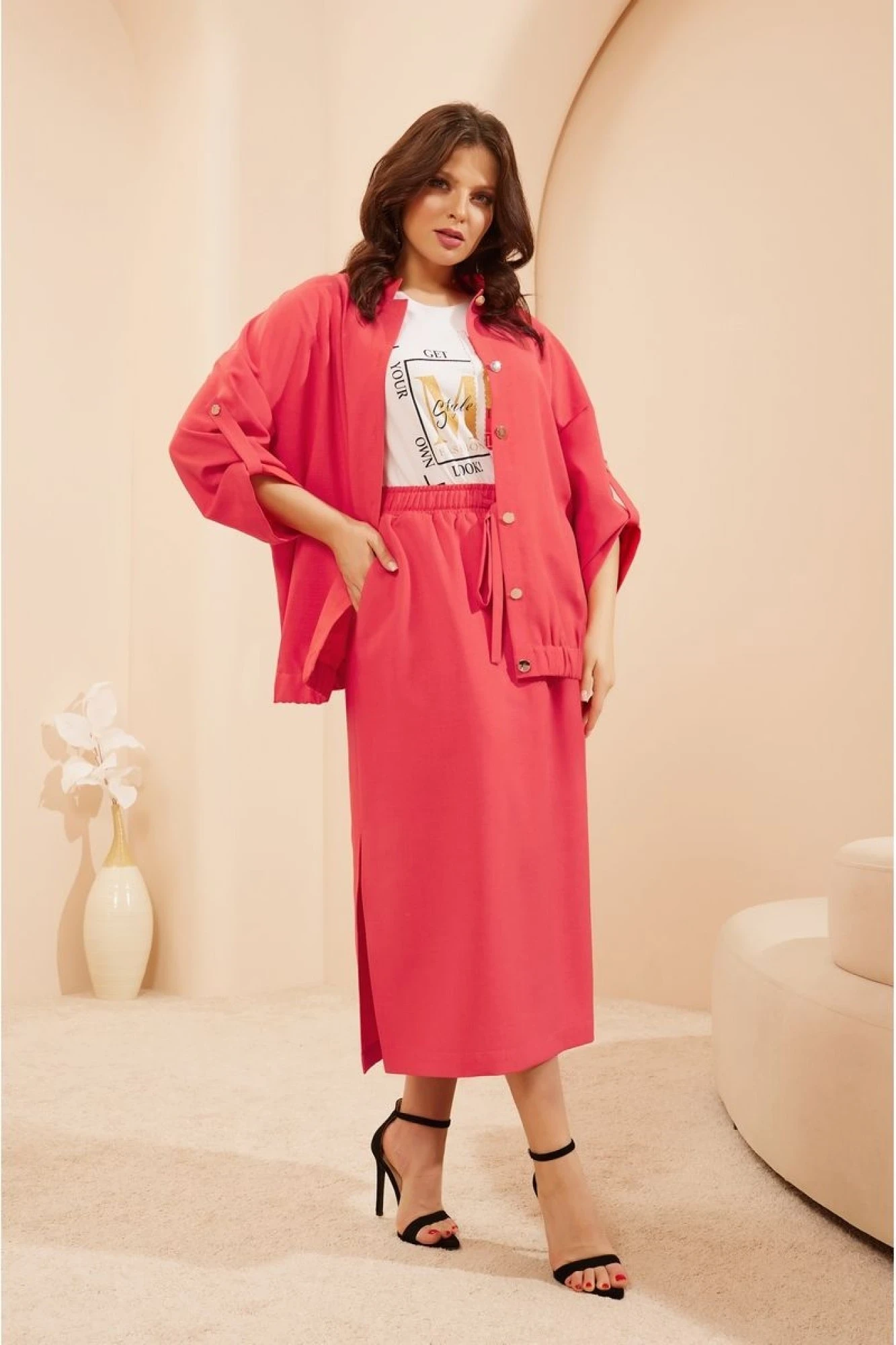 Дизайнерский юбочный костюм выполненный в стиле Casual отличный выбор для современной женщины. Жакет – Бомбер на основе цельнокроеного покроя прямого силуэта мягкой формы с воротником стойкой и центральной застежкой. Застежка на петли и пуговицы, по низу широкая резинка. Линия плеча спущена, рукав с отворотом фиксируется патой. Футболка цельнокроеного покроя с округлым вырезом выполнена из вискозы, по горловине и низу рукава узкие отрезные бейки. Перед украшен авторским принтом. Юбка миди прямого силуэта с косыми карманами и разрезами по бокам на притачном поясе. Пояс на резинке с завязками. (ЮБКА НА Х/Б ПОДКЛАДКЕ)