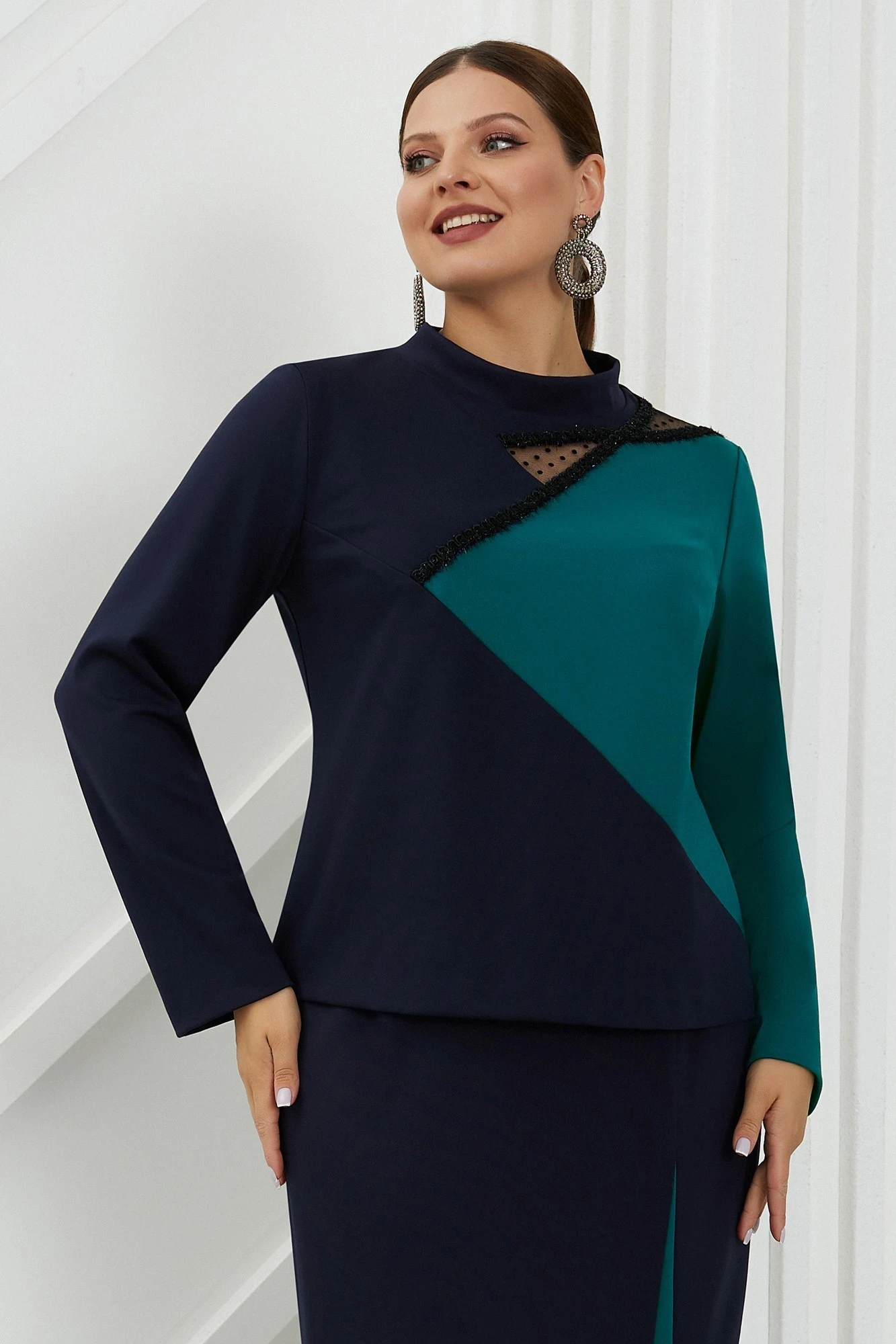 Джемпер с воротником стойкой. Перед с дизайнерскими отрезными деталями и с декоративной тесьмой и сеткой в верхней части. Спинка с талиевыми вытачками. Рукава втачные.